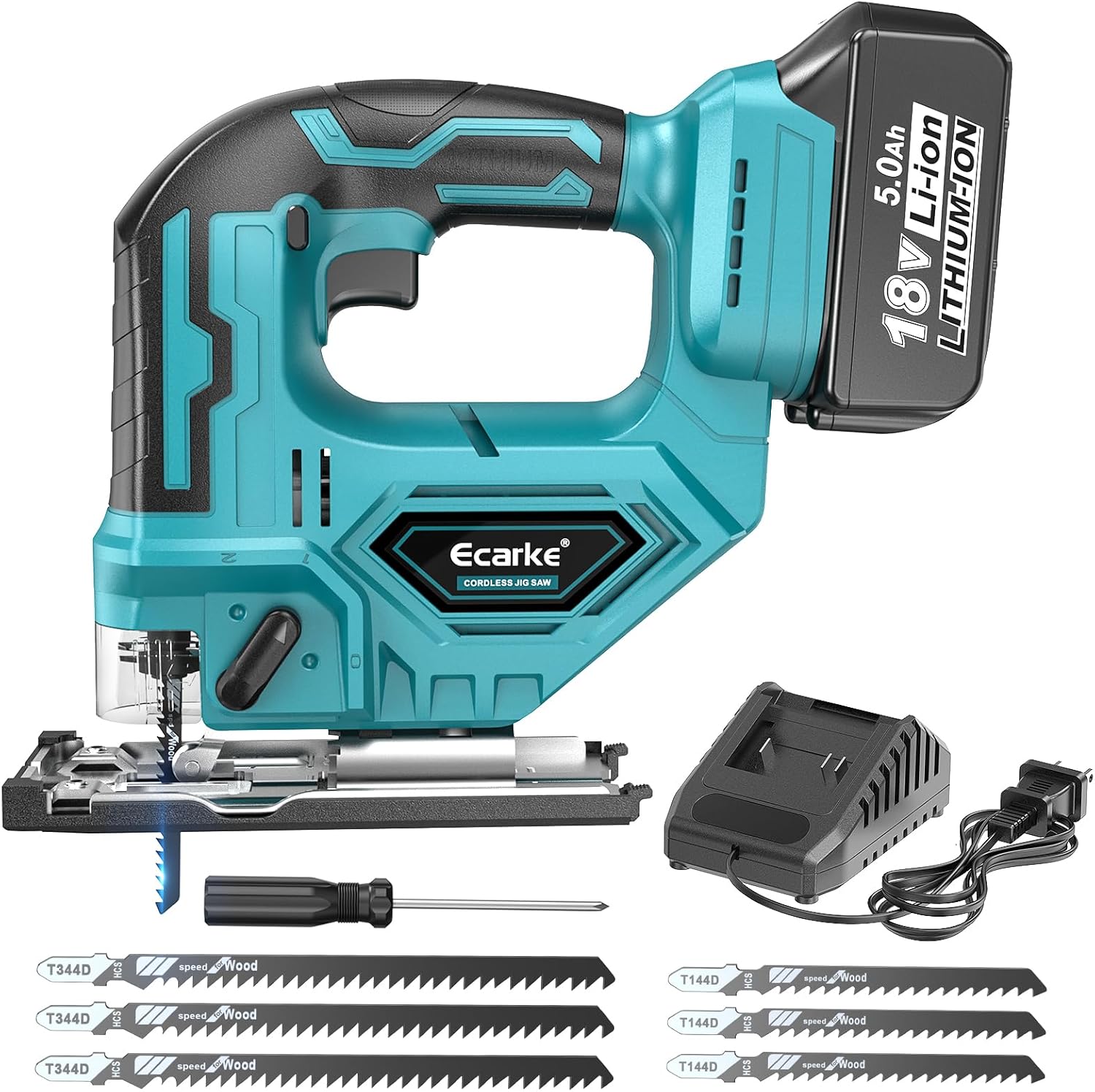【Compatible With Makita battery】The jigsaw compatible with Makita 18v With cordless design, the cordless jigsaw is compatible with Makita 18v battery such as BL1830B BL1840B BL1850B BL1860B. The jigsaw tool cordless offers portability, perfect for confined spaces ensuring wire-free operation. this jigsaw come with 1 Ecarke 5Ah battery and 3A 60W faster dual-function chager that both Ecarke and Makita batteries