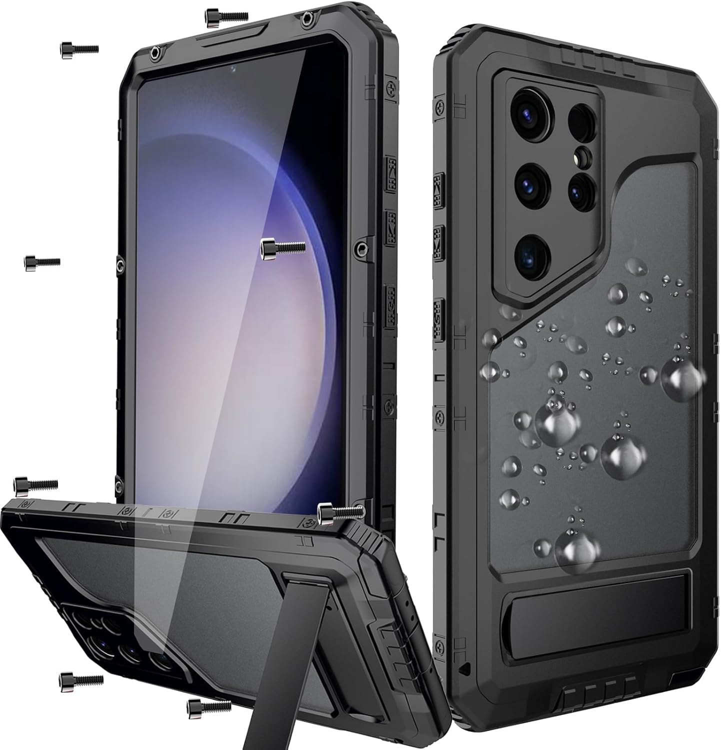 Compatibility: The waterproof case with kickstand is designed exclusively for Samsung Galaxy S24 Ultra (2024 Released); You will get: 1x Samsung Galaxy S24 Ultra waterproof case, 8x Screws, 1x Screw tools; The S24 Ultra metal case is full coverage design, dust-proof and anti-scratch, it will also provides a daily protection in your life