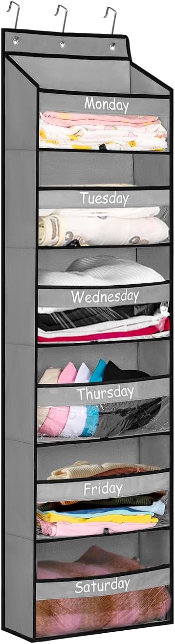 Weekly closet organizer and storage comes with 3 hooks to easily fit the standard size door, making it stable when picking and putting clothes. Baseball caps organizer has plastic board on each layer so it can fully bear the weight of a week's clothes, more durable than other similar products with cardboard.
