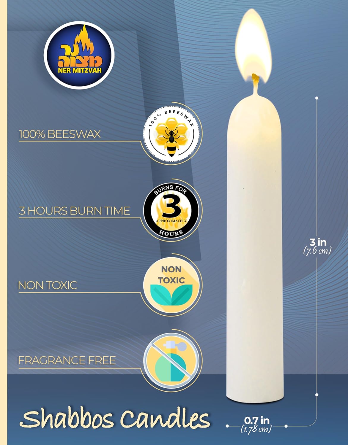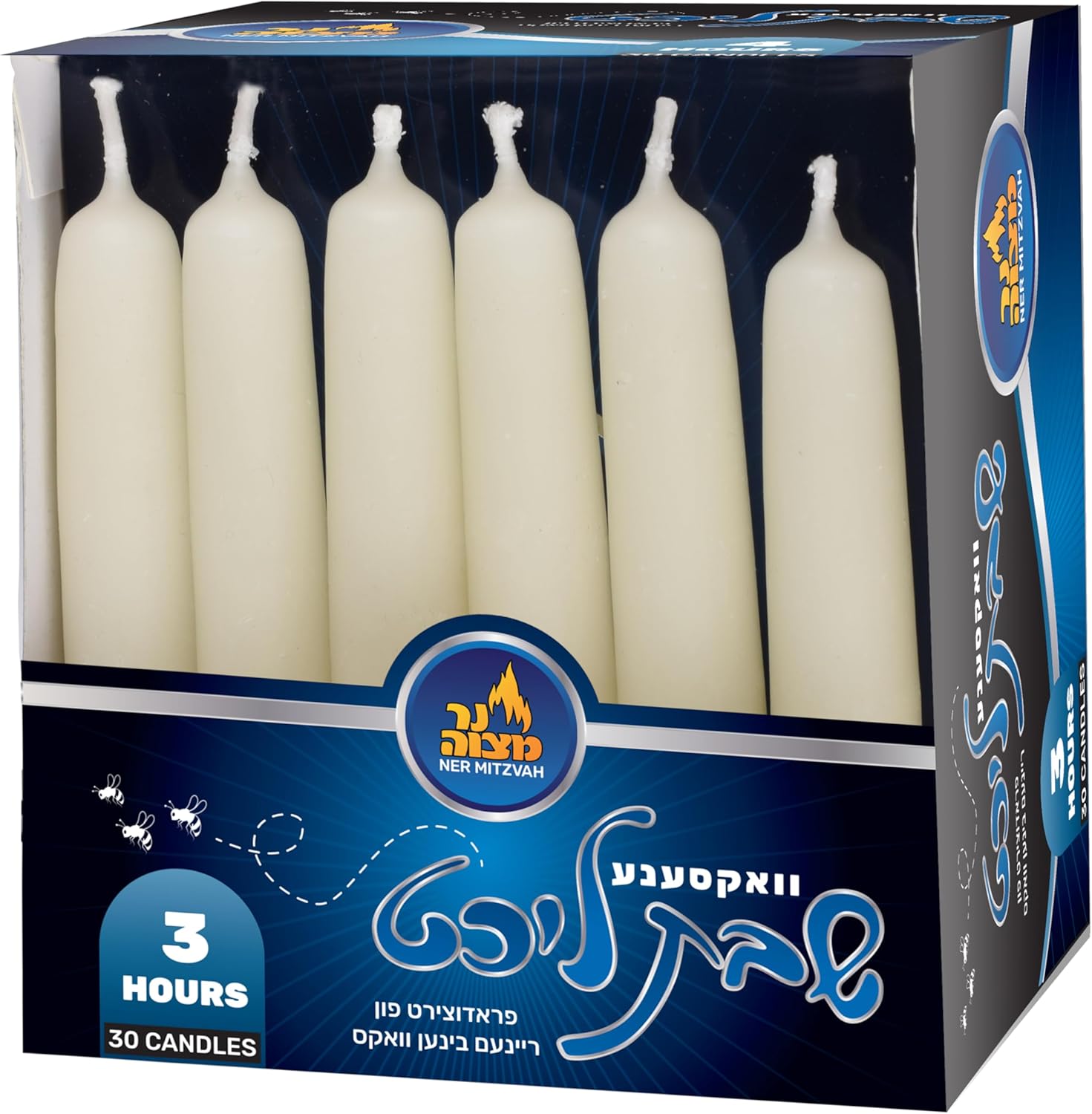 White Beeswax Shabbat Candles - Hand Dipped, Unbleached Traditional Shabbos Candles - 35 Pack - 3 Hour Burn Time - by Ner Mitzvah