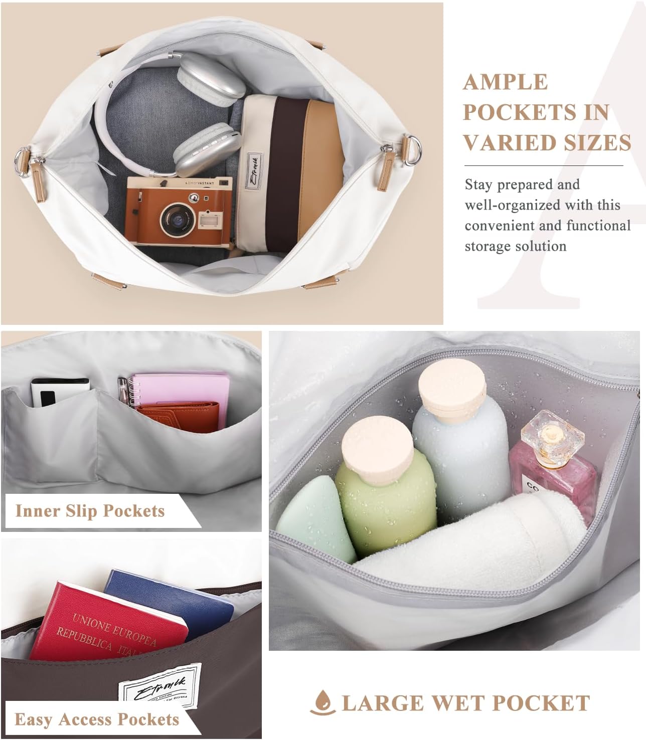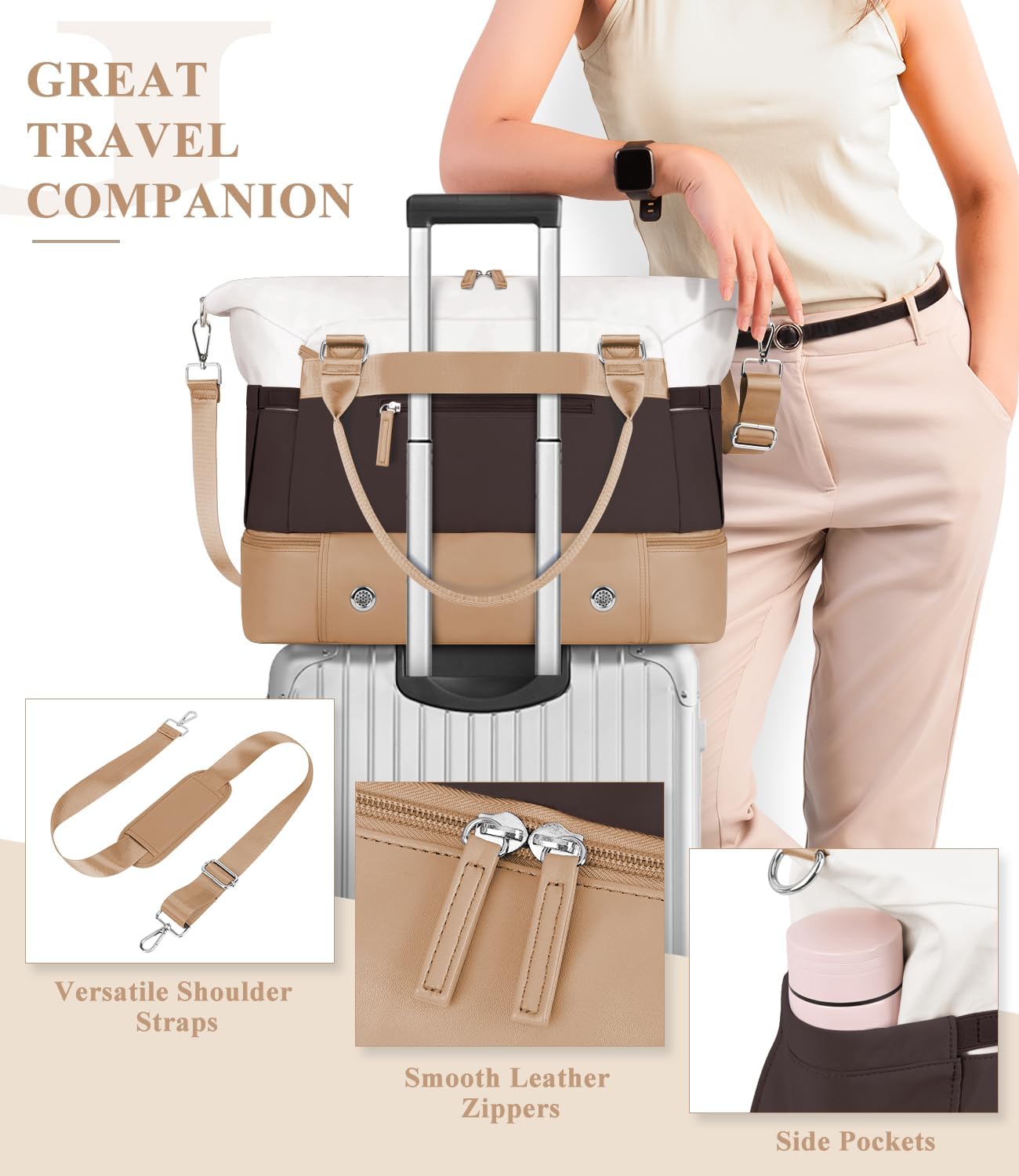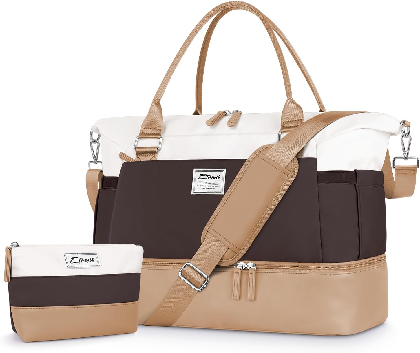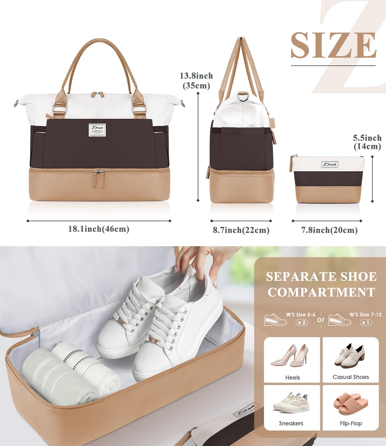 ETRONIK Weekender Bags for Women, Personal Item Travel Bag with Shoe Compartment, Carry On Overnight Bag with Toiletry Bag, Gym Bag with Wet Pocket, Duffel Bag for Travel, Sports, Hospital Khaki&Brown