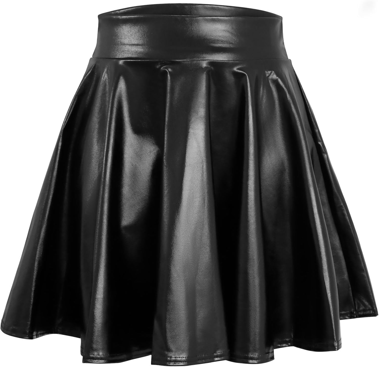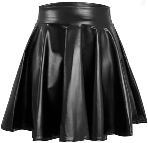 LEACOOLKEY Women's Fashion Flared Pleated A-line Skater Skirt Shiny Stretchy Skirt for Casual/Music Festival/Halloween Black