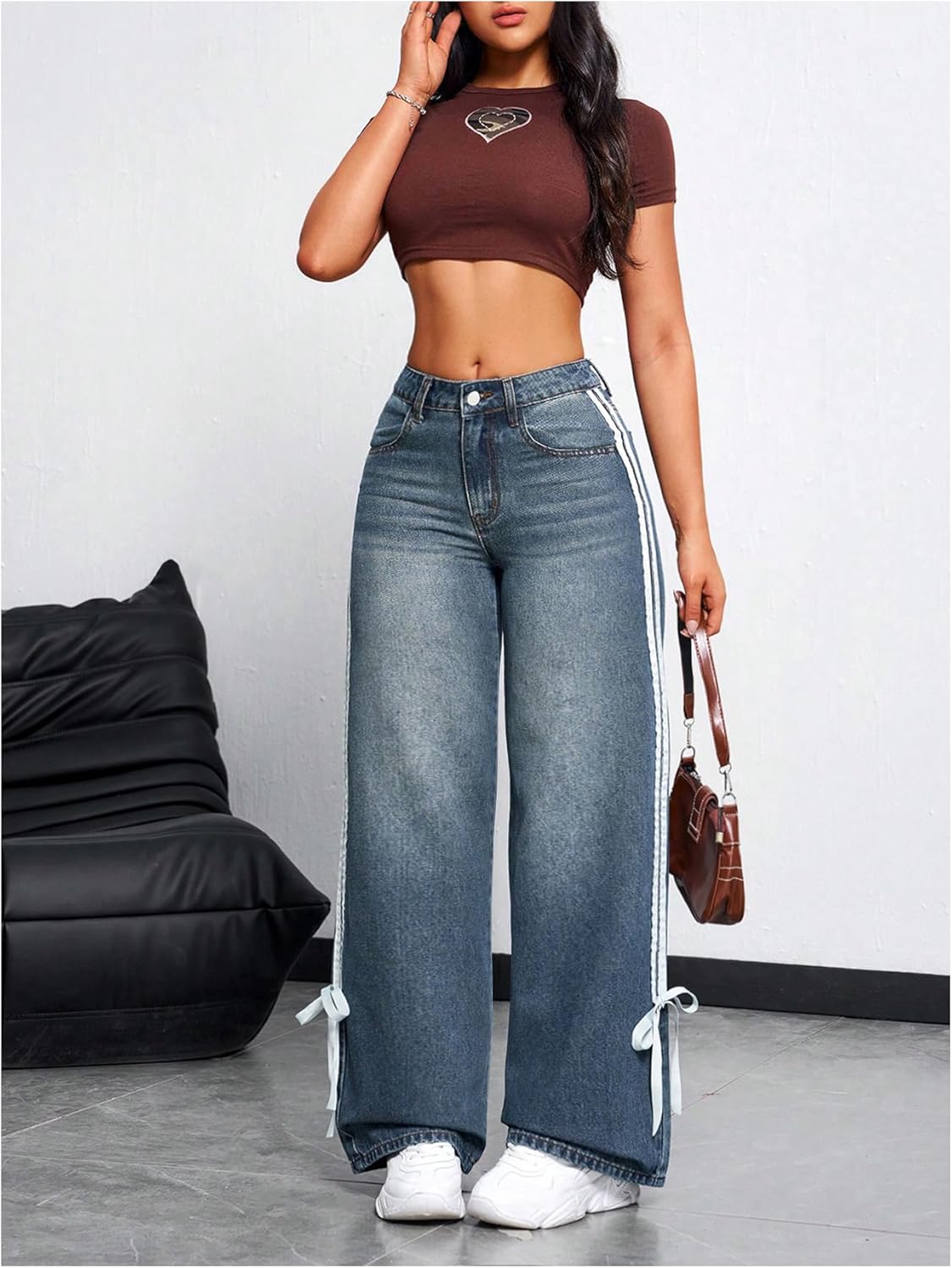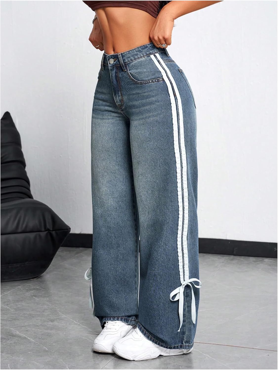 MakeMeChic Women's Straight Wide Leg Denim Pants Striped Bow Rise Jeans with Pocket Y2K Streetwear