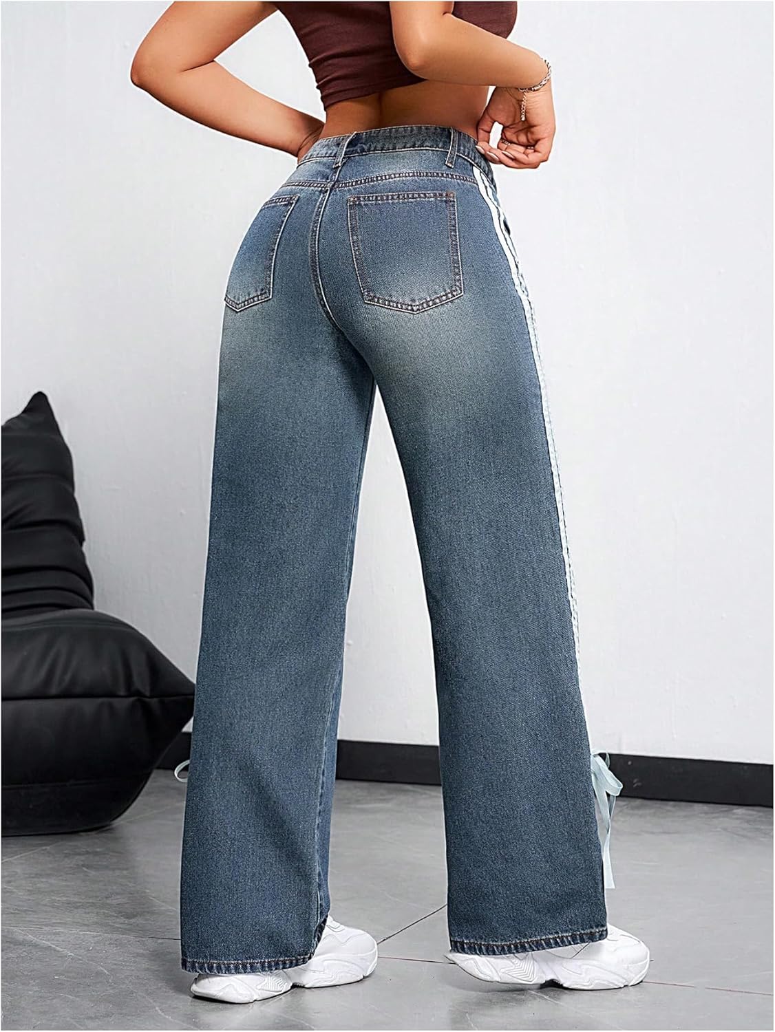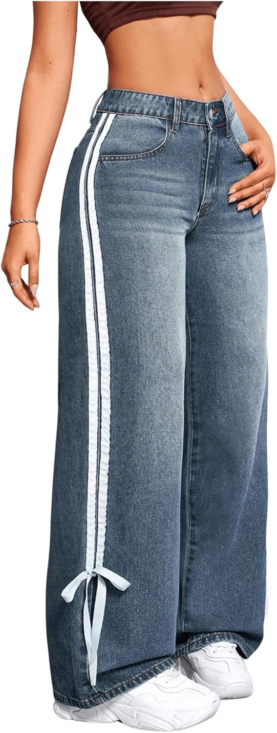 MakeMeChic Women's Straight Wide Leg Denim Pants Striped Bow Rise Jeans with Pocket Y2K Streetwear