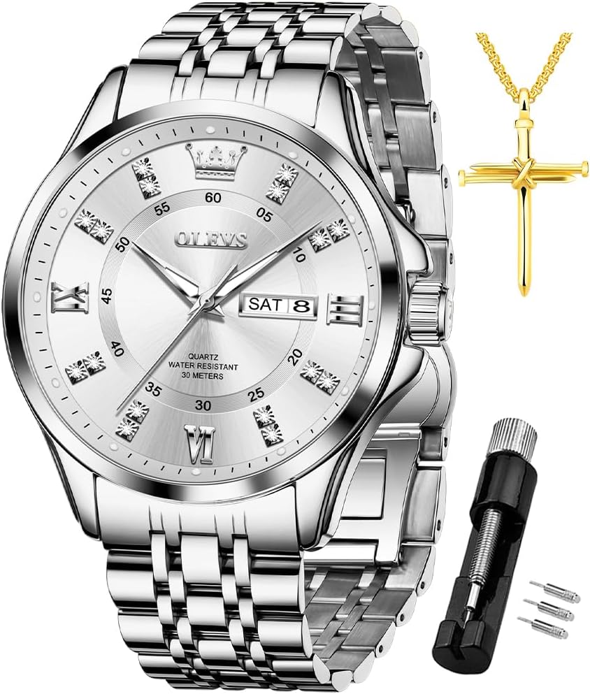 OLEVS Diamond Watches for Men,Business Dress Watch Waterproof Luminous,Male Golden Big Dial Luxury Casual Quartz Analog Watches with Day Date Calendar and Stainless Steel Band