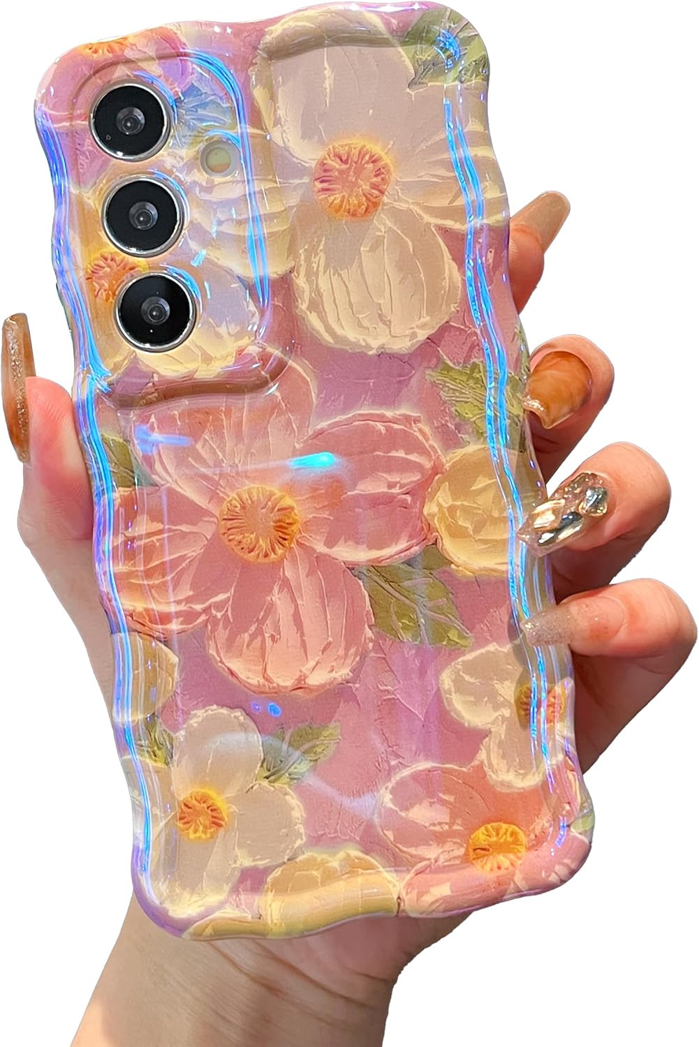 XIZYO Case for Samsung Galaxy S24 Plus, Colorful Retro Oil Painting Flower Cute Floral Aesthetic Curly Wave Frame Laser Glossy Reflective Exquisite Stylish Cover Girly Women-Pink