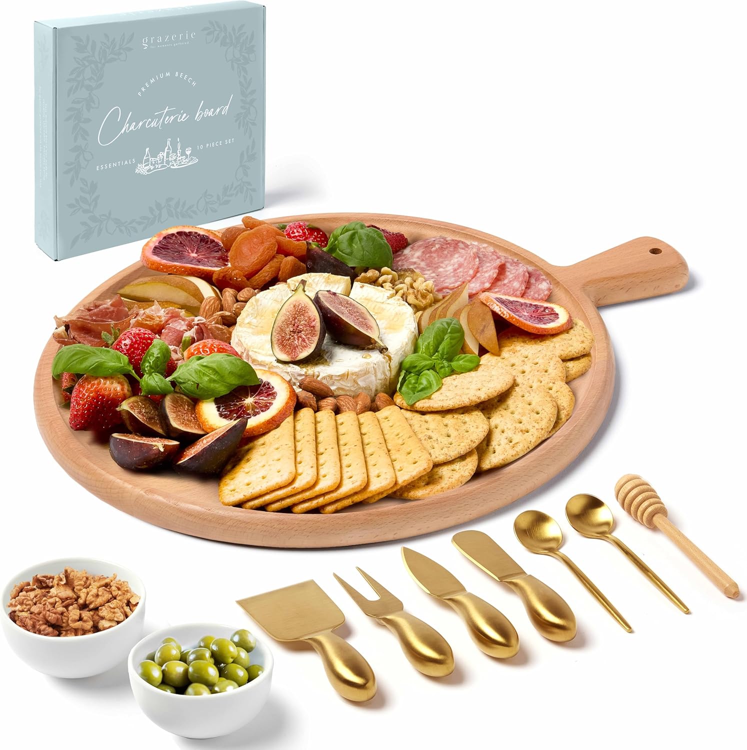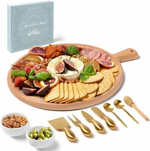 Charcuterie Board Set - Round Solid Wood Cheese Board for Serving with Accessories - House Warming Gifts for New Home, Bridal Shower & Wedding Gift, Birthday Gifts for Women