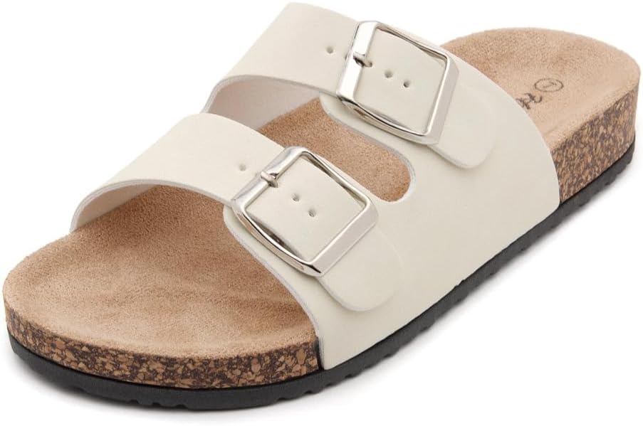Herstyle Softey Womens Cork Footbed Sandals - Adjustable 2-Strap Comfort Slides | Slip On Open Toe Flat Sandals for Women | Summer Beach Casual Everyday Wear