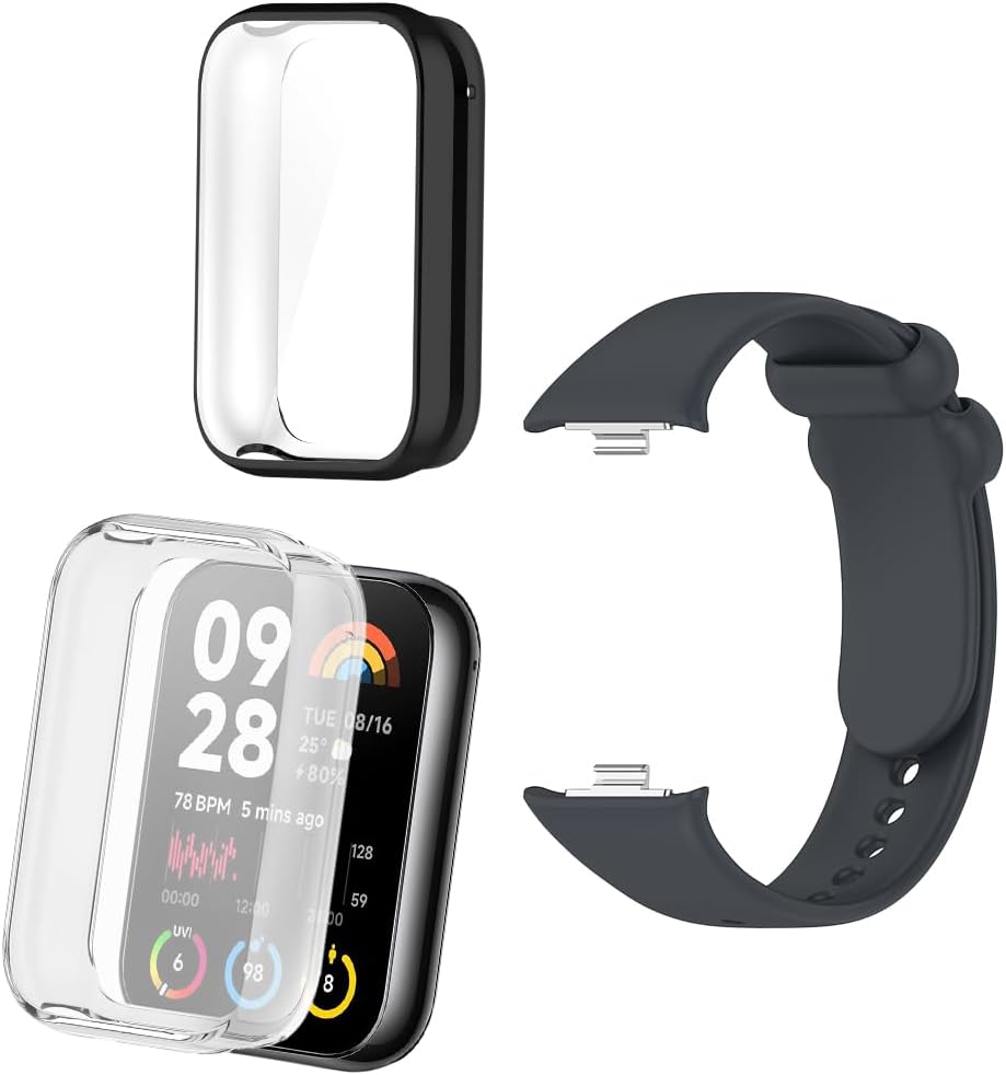 Screen Protector Cases and Strap Compatible for Xiaomi Smart Band 8 Pro Accessories Soft TPU Full Coverage Smartwatch Case and Soft Silicone Band (Pack of 2+1)