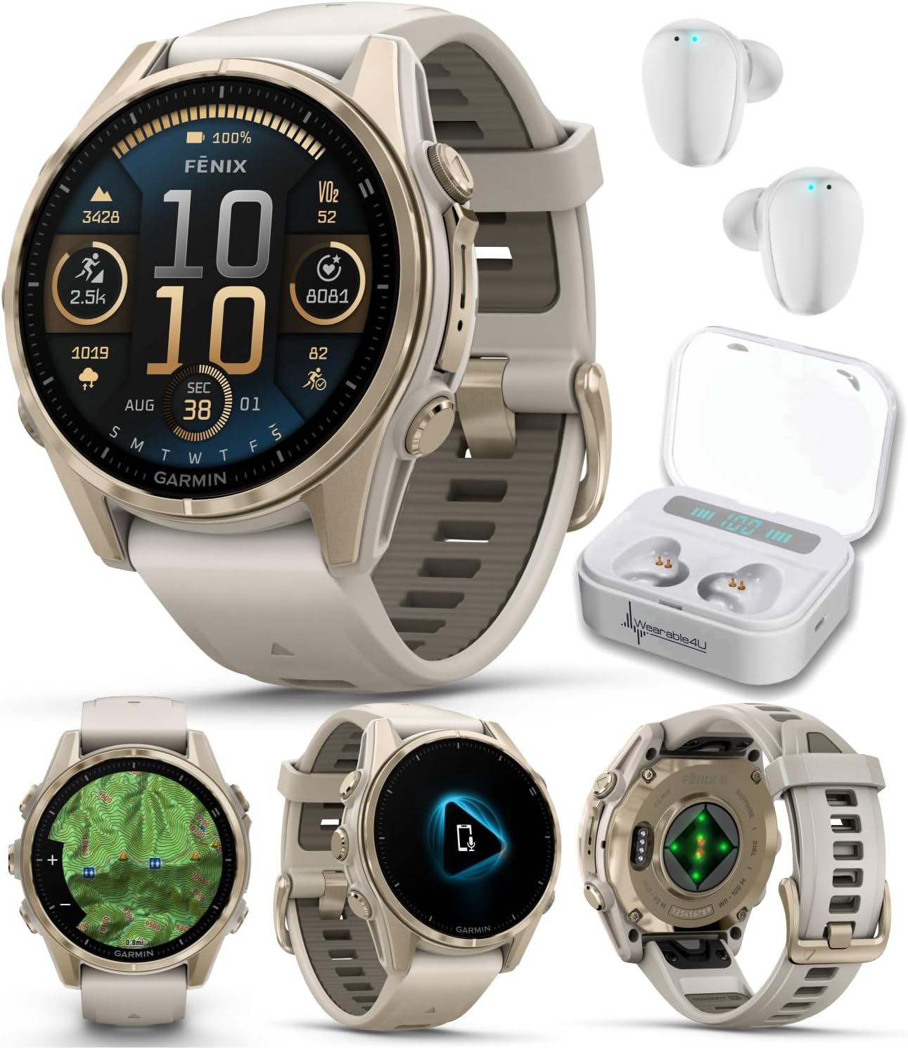 Wearable4U Garmin Fenix 8 – 43 mm Sapphire, AMOLED Multisport GPS Smartwatch, Soft Gold with Fog Gray/Dark Sandstone Silicone Band, Built-in LED Flashlight White Earbuds Bundle