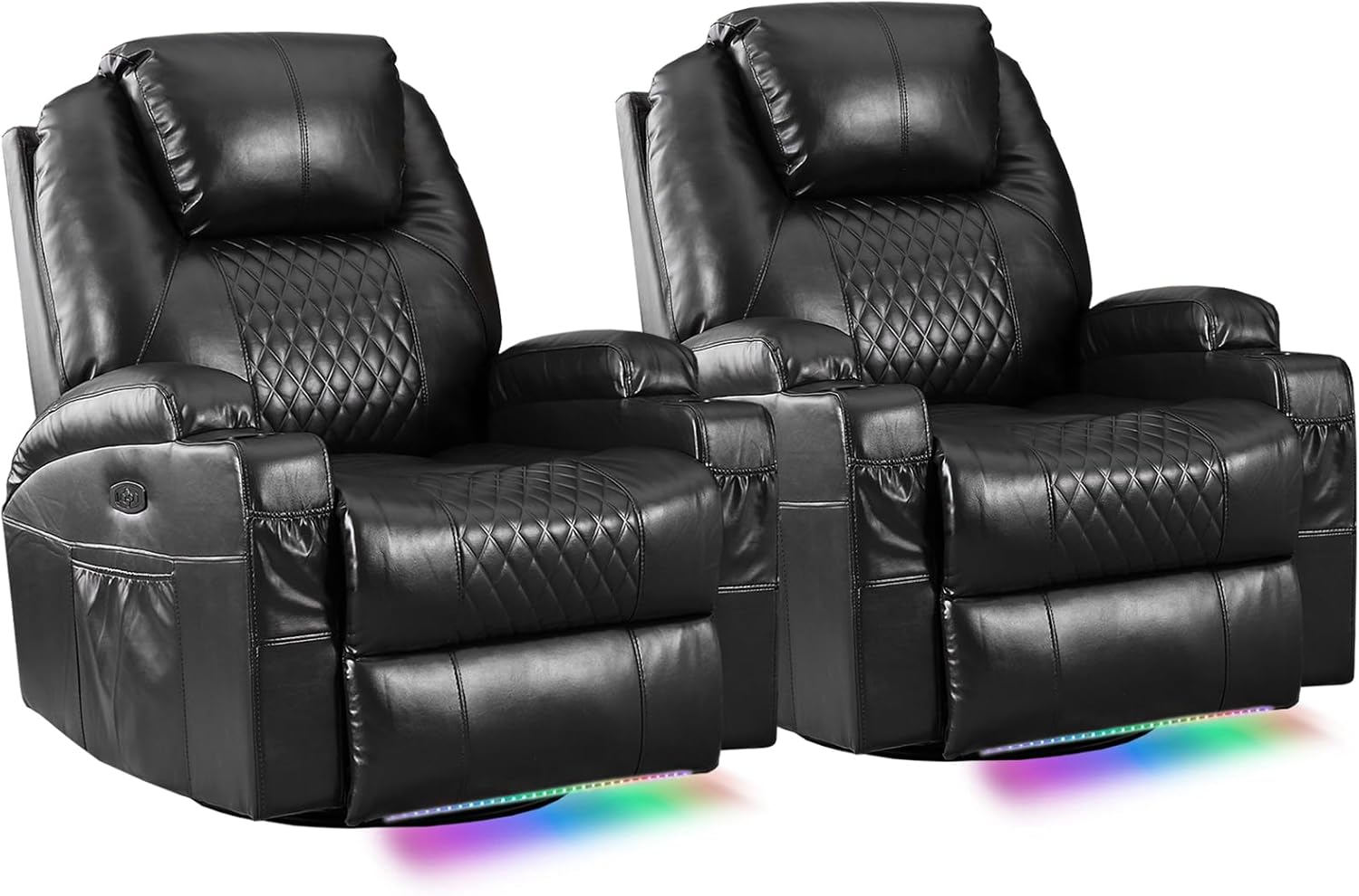 Power Swivel Rocker Recliner Chair with Massage and Heat/LED Lights/USB and Type-C Ports/Infinite Position/Cup Holder, Electric Glider Reclining Sofa for Nursery Living Room (2, Black)