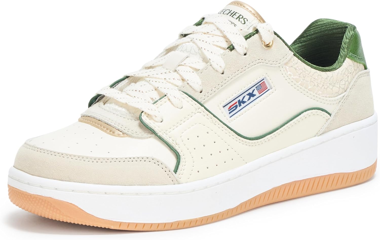 Elevate your casual style with these running shoes for women from Skechers. The Sport Court 2.0 Metallic Break sneakers combine modern fashion with superior comfort. Featuring a sleek duraleather and pigskin suede upper with eye-catching metallic trim, these womens sneakers deliver both style and functionality. The Air-Cooled Memory Foam insole provides exceptional cushioning, while the flexible traction outsole ensures stable footing for all-day wear.