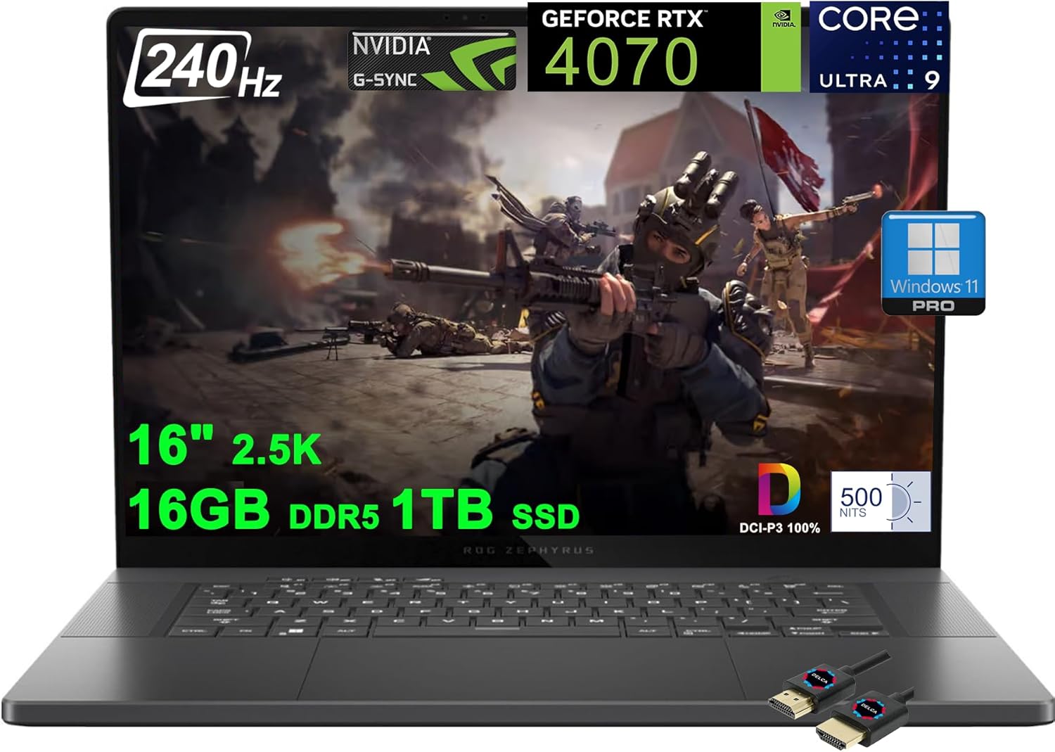 KEY SPECIFICATIONS: PC Type: Gaming Laptop Computer PC Series: ASUS ROG Zephyrus G16 Processor: Intel 16-core Ultra 9 185H Memory: 16GB DDR5 Storage: 1TB SSD Graphics: NVIDIA GeForce RTX 4070 8GB Display: 16" 2.5K 2560x1600 OLED 240Hz (DCI-P3 100%, 500nits Brightness, G-SYNC) Keyboard: Backlit Keyboard Audio: Dolby Atmos, AI Noise-canceling Technology, Smart Amp Technology Operating system: Windows 11 Pro Ports & Slots: 1 x Thunderbolt 4, 1 x USB-C 3.2, 2 x USB-A 3.2, 1 x HDMI 2.1 FRL, 1 x SD Card Reader Battery: 4-cell 90Wh Additional Information: Dimensions: 9.69" x 13.94" x 0.65" Approximate Weight: 4.09 pounds