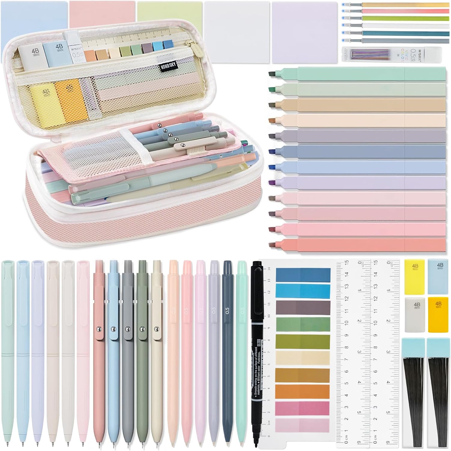 【52pcs College School Supplies Kit】This ultimate stationery set is ideal for both Bible journaling and college studies. It includes 12 pastel-colored Bible highlighters, 5 black gel pens, 6 colorful gel pens, 6 refills, 6 0.5mm mechanical pencils, 4 erasers, a colorful book tabs, 5 square sticky note pads, 2 pcs inch rulers, and a black marker. With everything you need for book annotation and note-taking, this set is perfect for Bible study, class, or creative journaling.