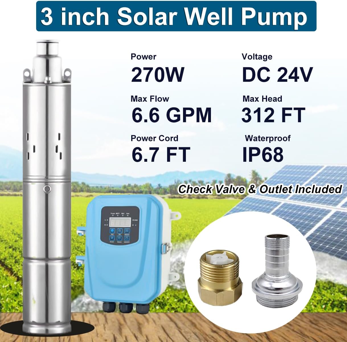 Solar Water Pump Technical Specifications: Solar DC well pump diameter: 3",Power:270w , Voltage: DC 24V,1" NPT discharge.PV open circuit voltage 24-50v with MPPT controller for farm, Garden, home, pool, Industrial (★ SOLAR PANEL NOT INCLUDED)