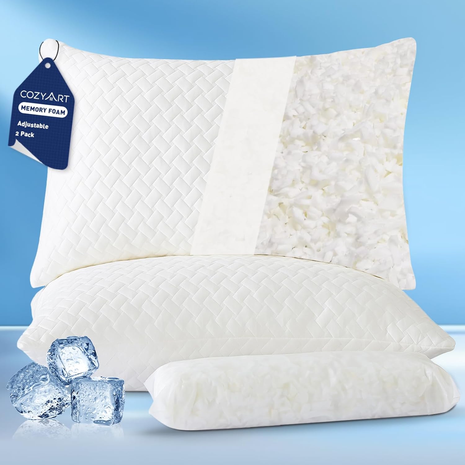 COZYART Shredded Memory Foam Pillows Queen Size Set of 2, Cooling Breathable Pillowcase, Adjustable Firm Bed Pillows for Side Back Stomach Sleepers