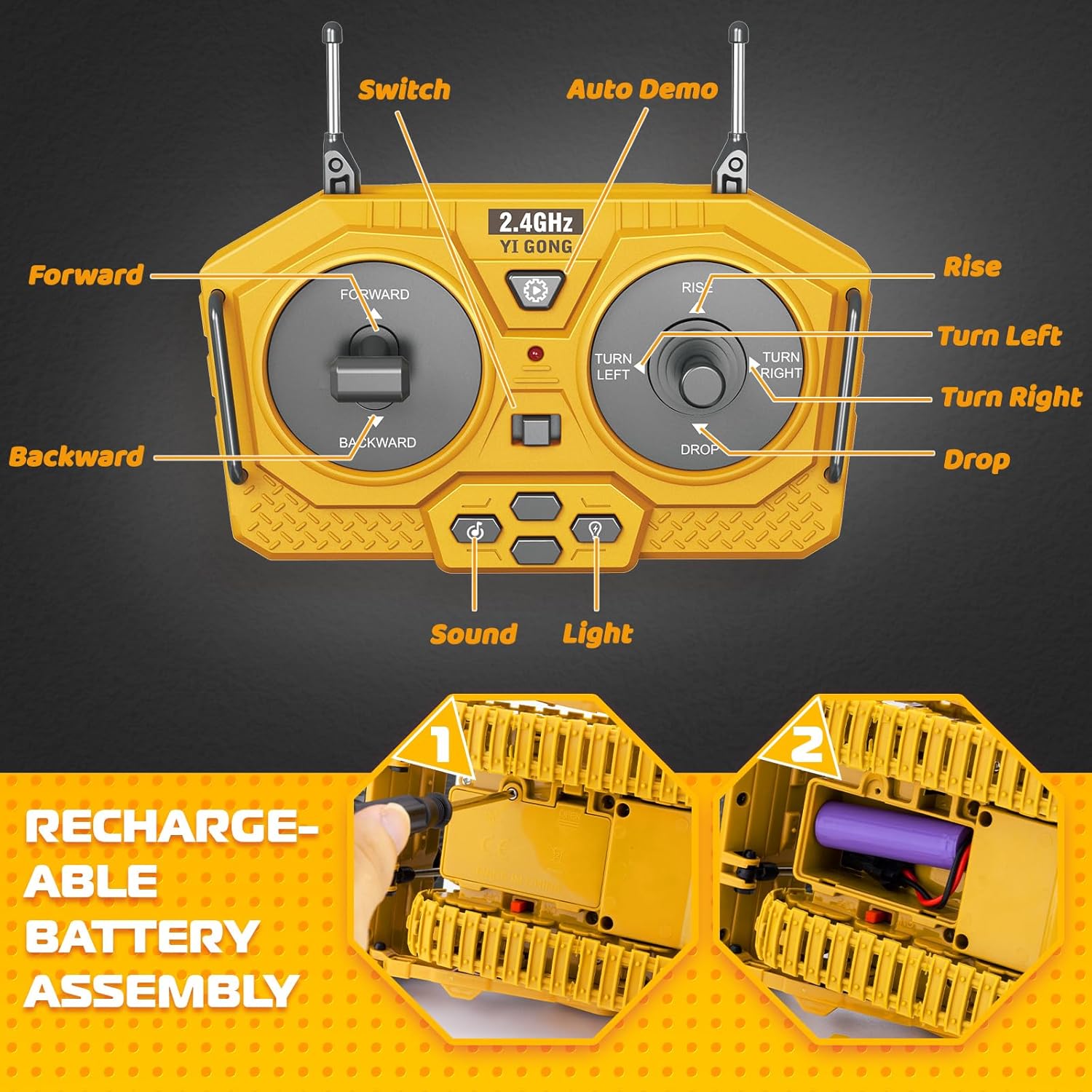 【Say Goodbye To Traditional Batteries】With the 2.4GHz frequency remote control , this bulldozer won't interfere with other remote control toys, multiple RC vehicles can be played with together. Comes with 3.7v rechargeable battery and battery charging cable. Say goodbye to constantly buying batteries with the rechargeable battery and charging cable included, providing long-lasting playtime