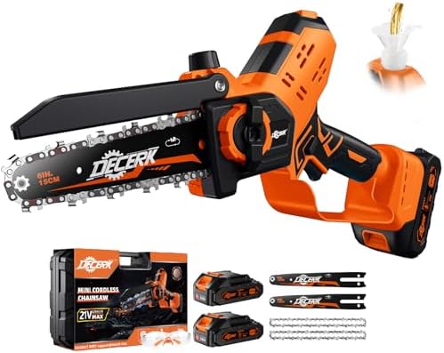 【2025 UPGRADED 4820-BRUSHLESS MOTOR】Take control of your yard effortlessly! DECERK brushless motor mini chainsaw delivers 700W power at 6500 RPM, cutting through 6-inch hardwoods in just 3 seconds—smooth as butter. Built to last 3x longer with a manganese steel chain and automatic oiling, it’s lightweight, portable, and eco-friendly (meets California standards). Perfect for pruning, camping, or gardening, it saves you hundreds on labor costs and makes outdoor tasks a breeze for years to come!