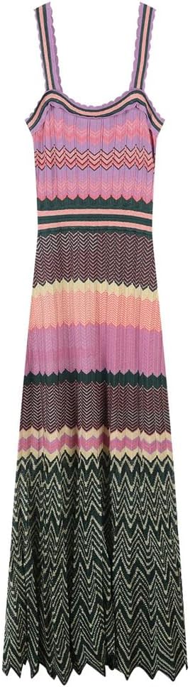 Womens Wavy Pattern Colorblock Striped Long Dress Knitting Pleated Camisole Dress Slip Long Dress AP M