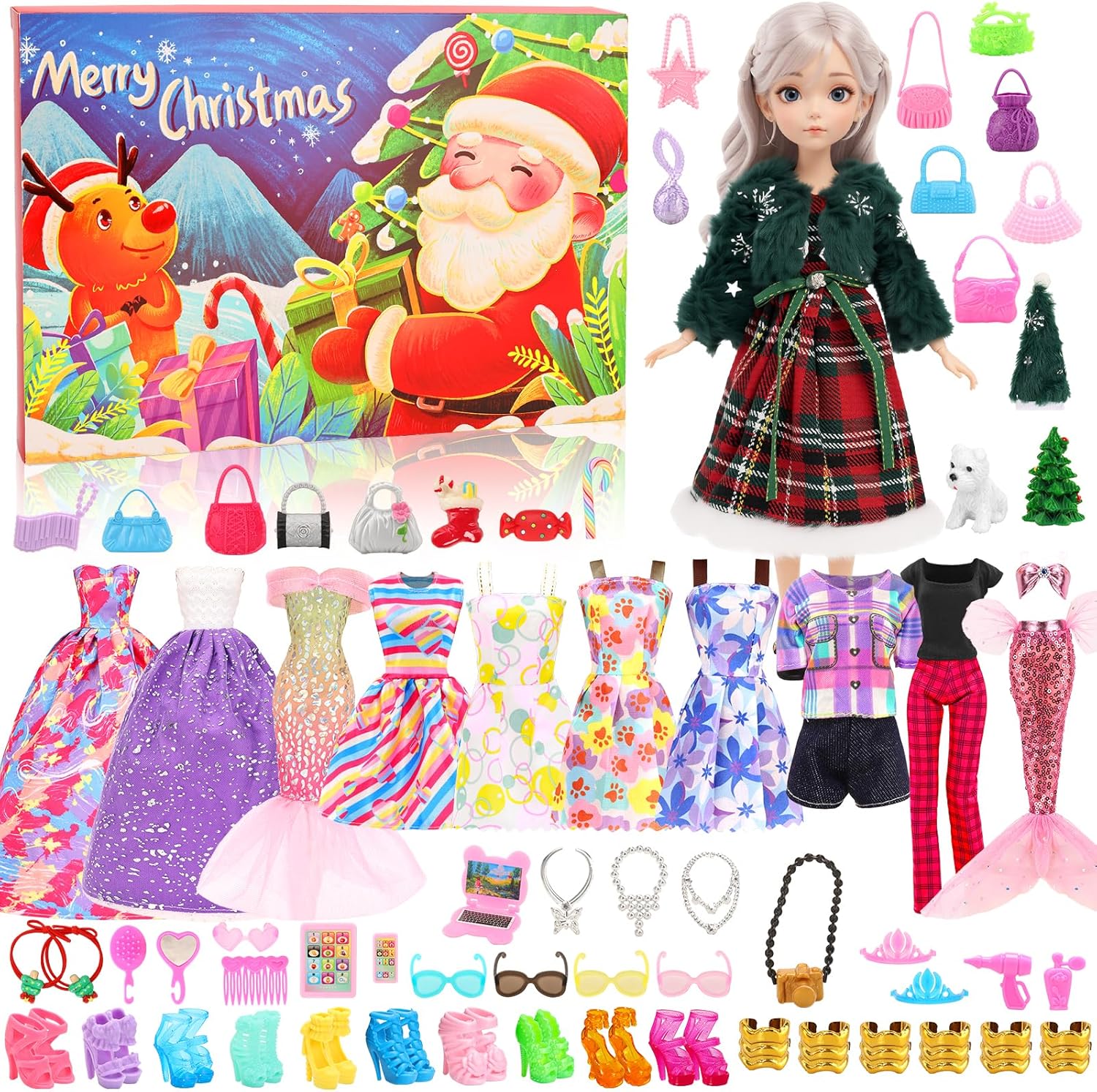 Doll Accessories - We not only have 37 daily dollhouse accessories such as 1 mini puppy, 5 pairs of high heels,5 bags, 3-piece computer set, 4 glasses, 5 headbands, and 1 DIY hair, but also 1 hat, 2 hair rings, 1 holiday blind box, and 6 accessories Christmas decorations.