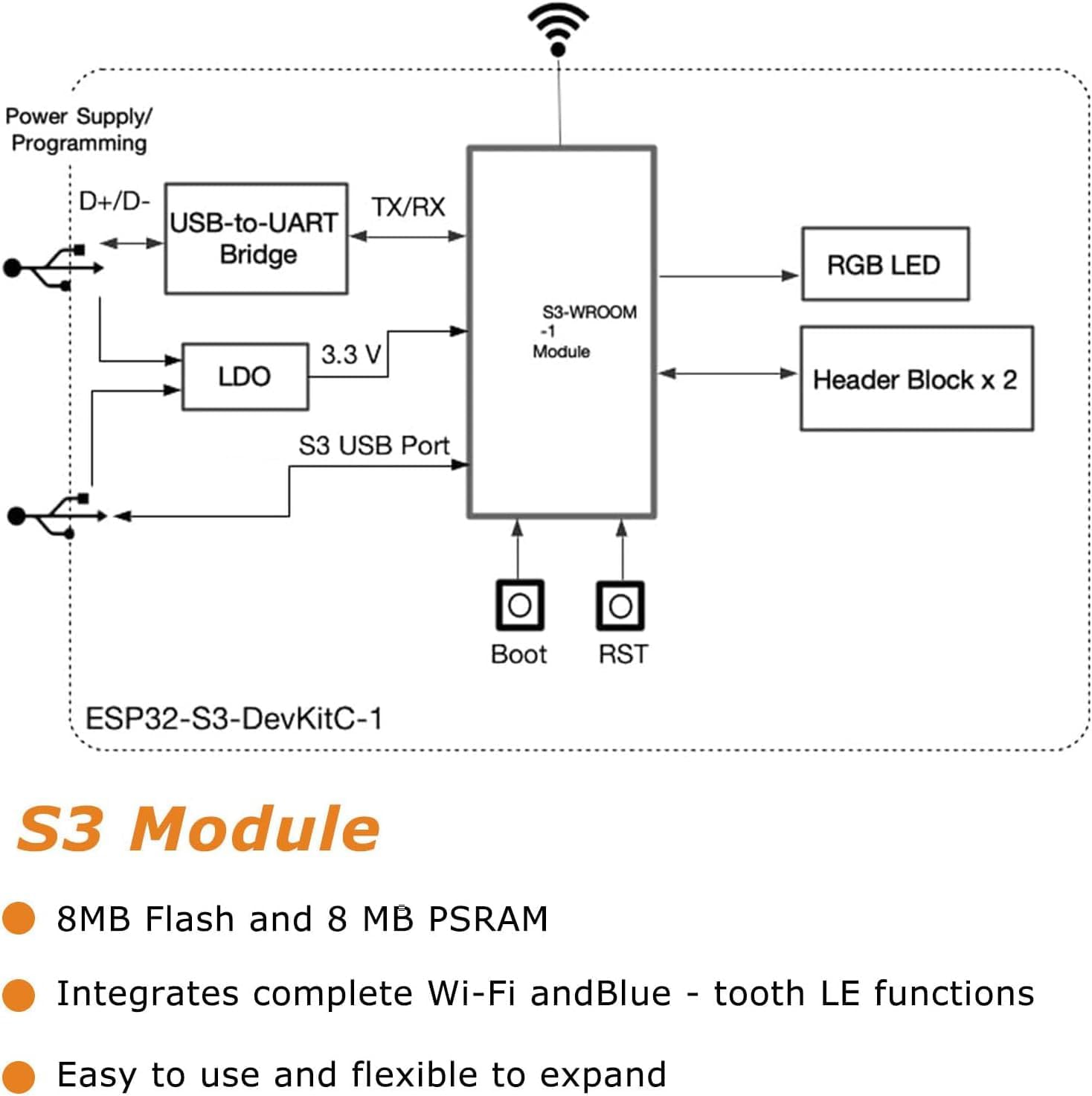 【Diverse connectivity options】: The ESP32-S3 supports dual-mode Wi-Fi and Bluetooth 5.0 (LE) connectivity for a wide range of smart devices, making it ideal for Internet of Things (IoT) applications.