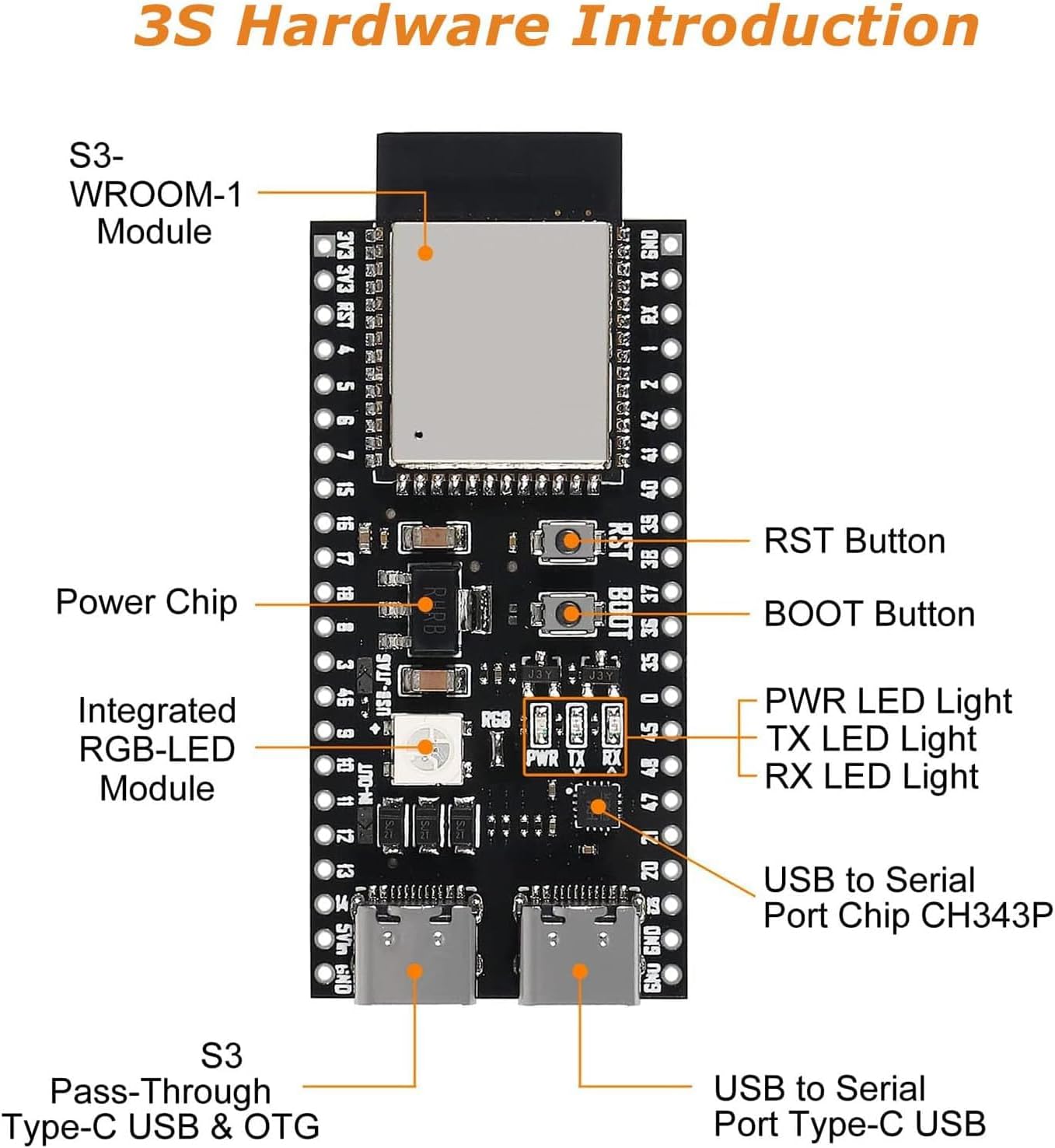 【Simple programming and debugging】: The ESP S3 module makes it easy to program and burn in your S3 board via dual USB Type-C ports, with a choice of USB or UART modes.