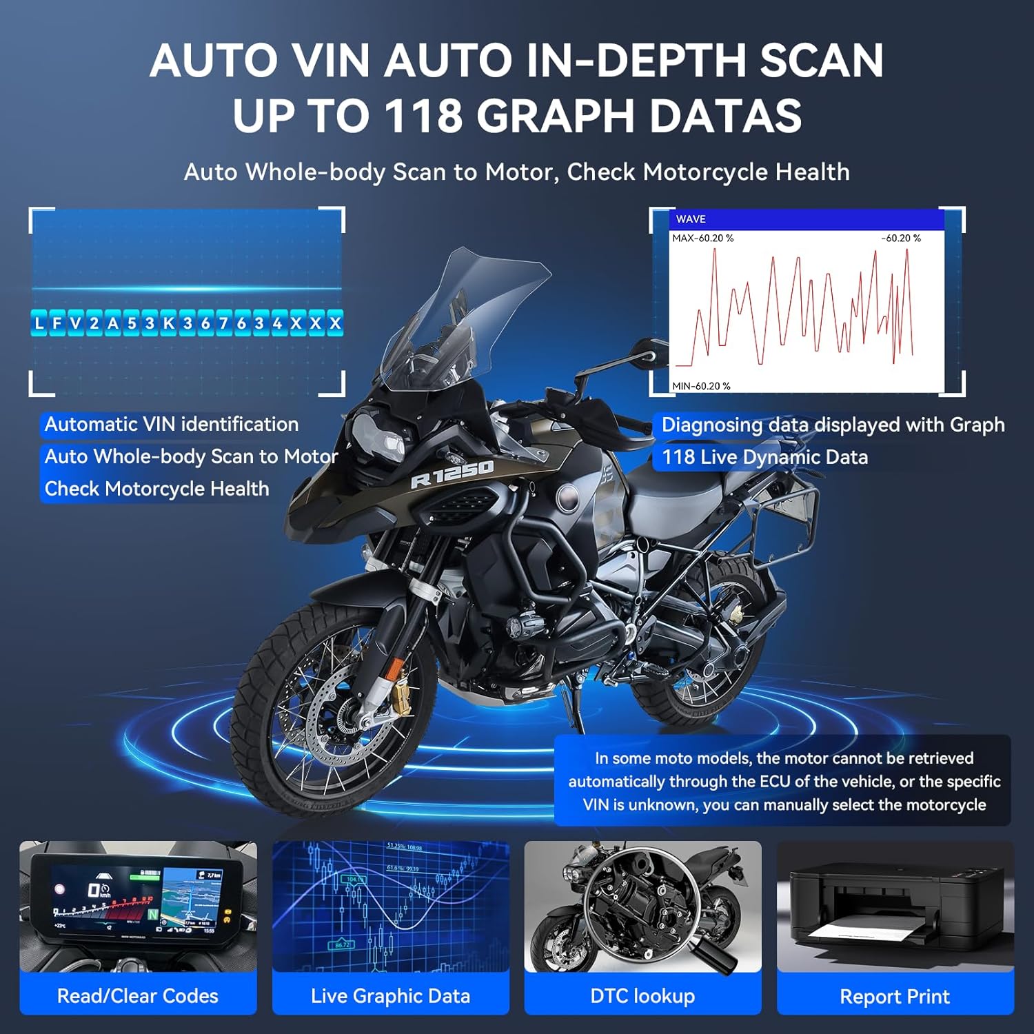 【118 REAL-TIME GRAPH DATA MONITORING】 Offers real-time monitoring of all motorcycle metrics such as engine RPM, temperature, and speed ect. Show with dynamic graphic waveform for Simple & fast to know accurate data instead of relying on boring characters,4-inch LCD screen 480*320 HD resolution allowing you to keep an eye on motor real-time performance during motorcycle maintenance / daily body-checking to BMW motorcycle before driving. It supports report custom and report printing via pc.