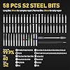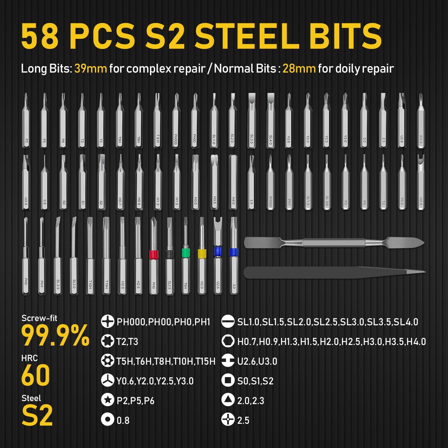 58 IN 1 METAL DRILLS: Mini power screwdriver has 58 bits in 16 categories and comes with 2 boxes of portable drills for a variety of repair tasks.S2 Hardened steel ensures a long and safe service life. Quality tools for quality work.