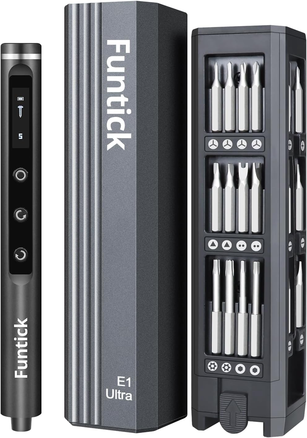 What's in the box: 1 mini electric screwdriver, 1 storage case, 2 portable screwdriver head storage cases (16 precision tips), 42 precision tips (all tips shown), 1 tweezer, 1 pry bar, USB Type-C charging cable, 1 user manual