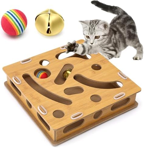 Cat Puzzle Toy: Innovative maze design stimulates cat's natural curiosity; Includes bell ball and rainbow ball for interactive play; Encourages mental stimulation and physical exercise; Suitable for kittens and adult cats; Helps reduce stress and anxiety(Previously, the lack of rubber rings for fixing parts has been solved, please feel free to buy)