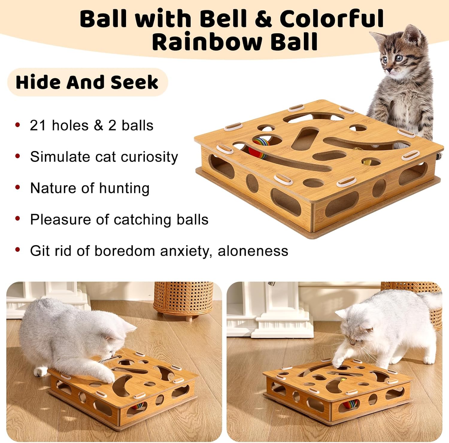 Interactive Cat Puzzle Toy with Bell & Rainbow Balls, Mental Stimulation Play Box for Indoor Cats & Kittens, Fun Maze Game for Boredom Relief & Exercise