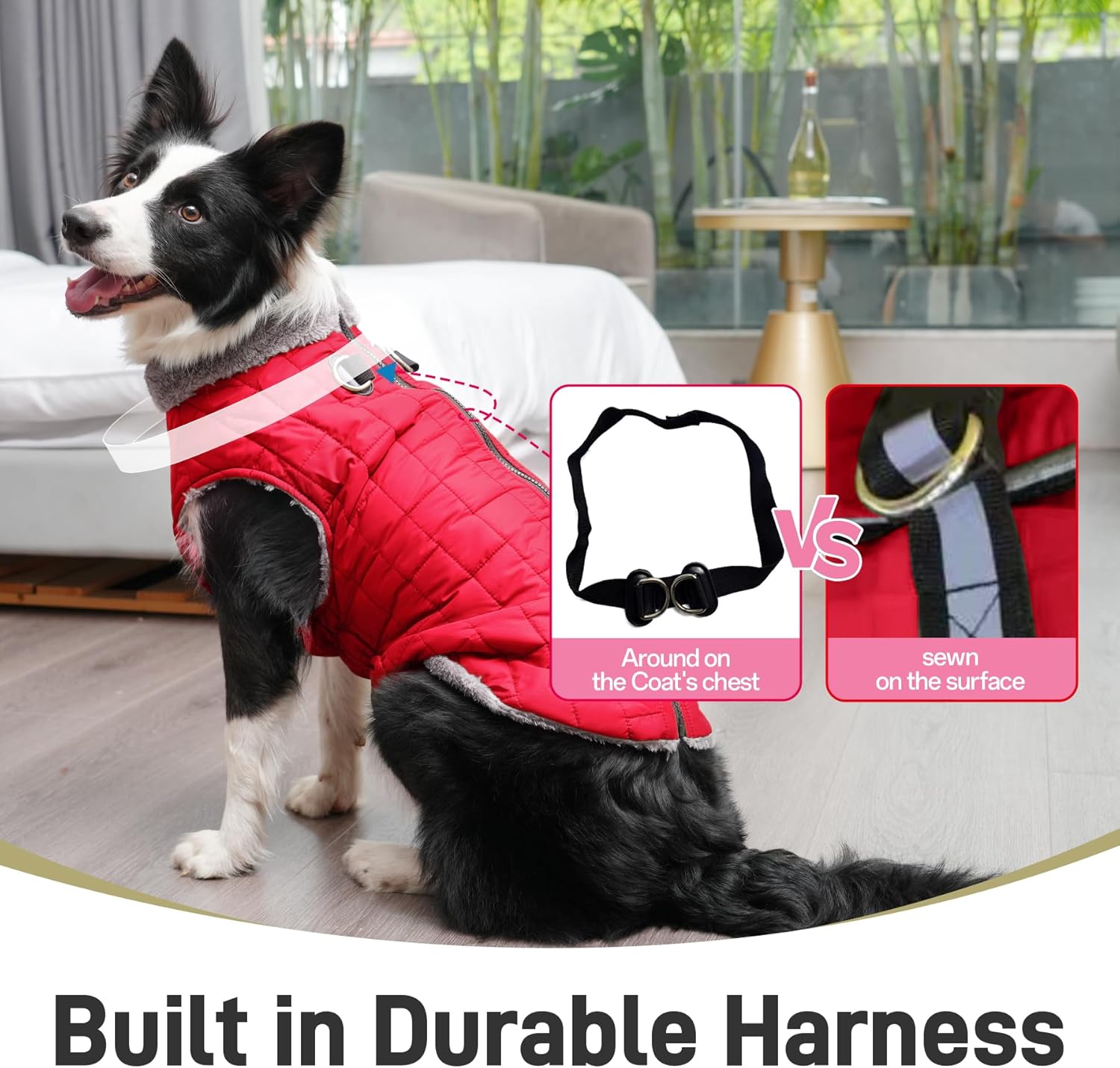 Warm Fleece Dog Coats with Durable Harness Buitl in D-Ring,Waterproof Puppy Jacket for Small Dogs,Dog Vest for Cold Winter,Red S