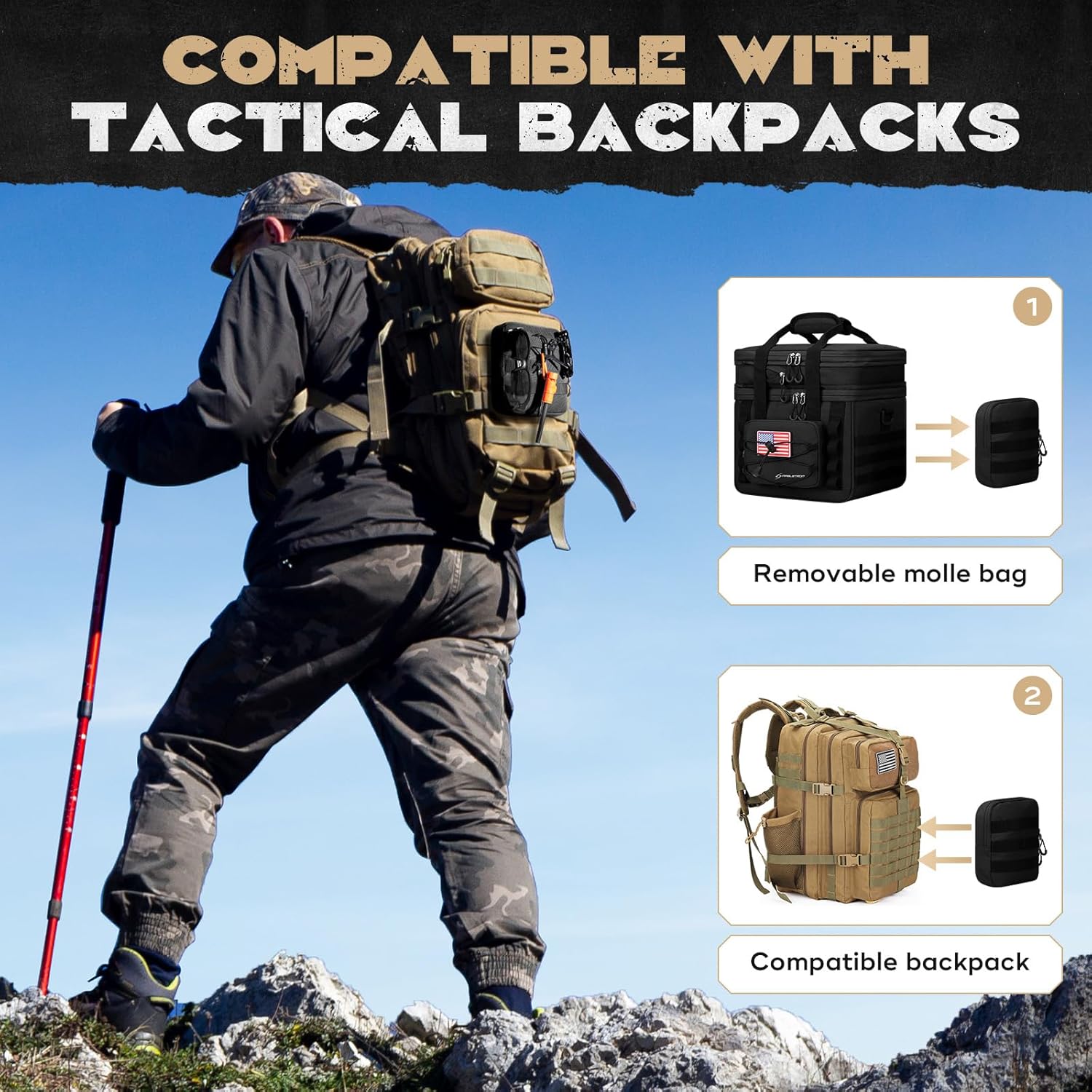 MORE DESIGN HIGHLIGHTS: Our adult lunch box is additionally equipped with MOLLE webbed ring and detachable storage bag, which can be used to hang knives, flashlights and other tools. Storage pockets with concealed buckle can be attached to the belt backpack as needed, very convenient. The front bag has Hook-and-Loop for fixing the national flag and other patterns, adding more fun for your lunch!