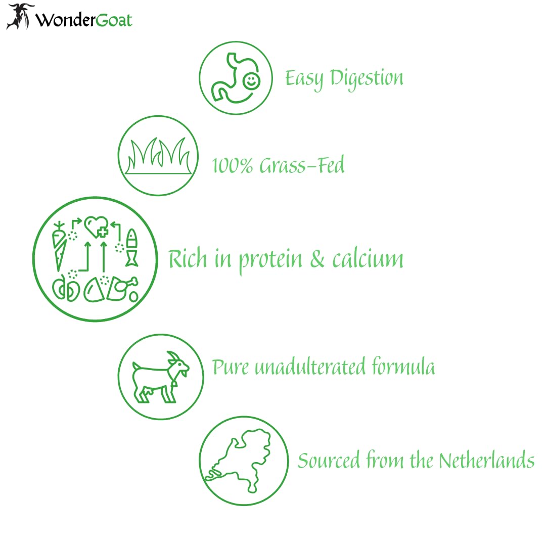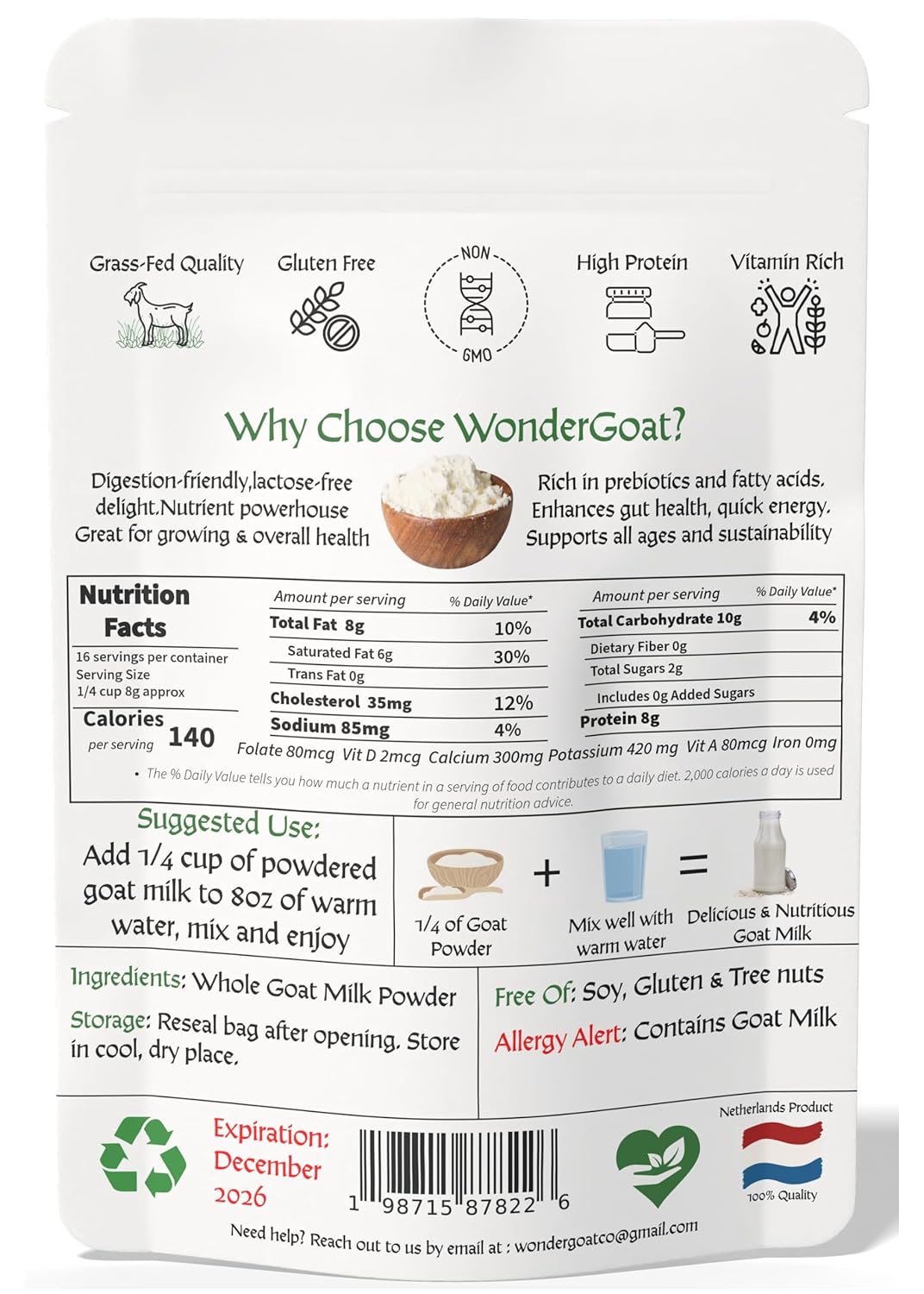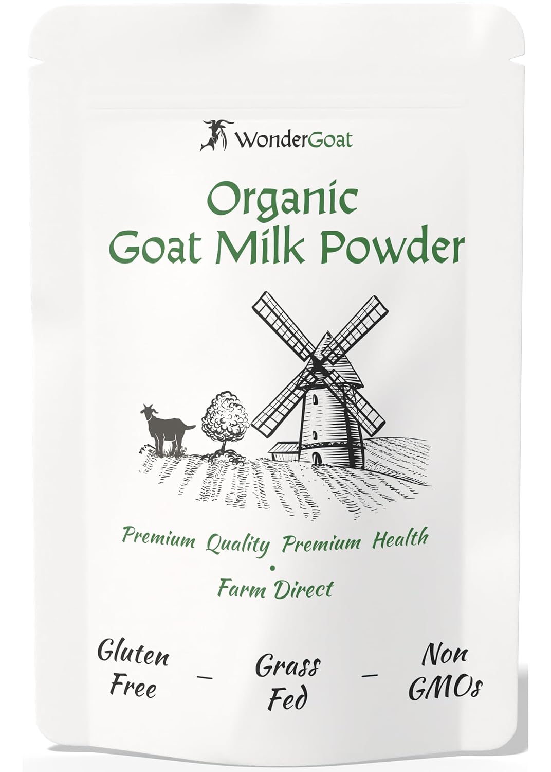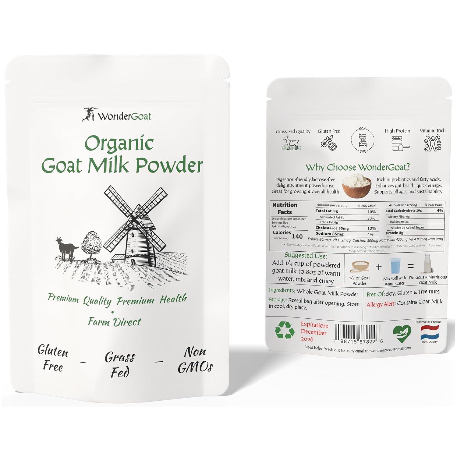 A Taste of Nature's Finest Indulge in the pure goodness of WonderGoat, a premium goat milk powder sourced from the pristine pastures of the Netherlands. Our 100% grass-fed, organic product is a testament to quality and purity. Each 1-pound pouch is packed with essential nutrients, including calcium, potassium, and vitamin B12, to support your overall health and well-being. Gentle on the tummy and rich in flavor, WonderGoat is perfect for individuals with lactose sensitivities or those seeking a healthier alternative to traditional dairy. Its versatility allows you to incorporate it into your daily routine, whether it's a creamy smoothie, a frothy latte, or a decadent dessert. Experience the difference of WonderGoat, a product that combines the best of nature and modern convenience.