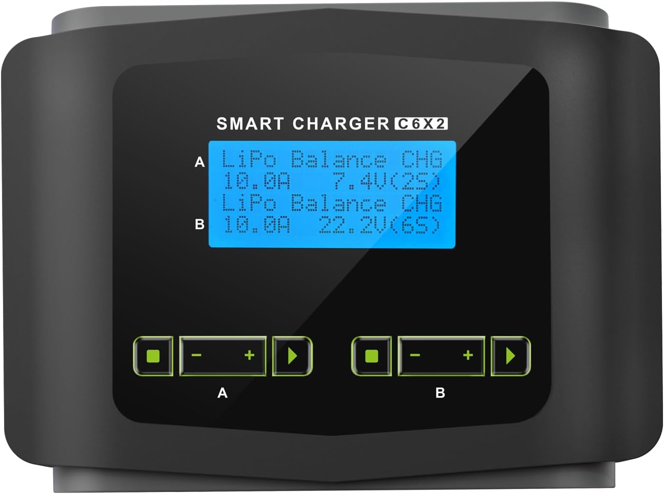 🚤🚲🚙【Dual Balanced Lipo Charger】C6X2 dual lipo battery charger is upgrade version of C150, It has two separate channels, which can charge two different batteries at the same time, without affecting each other. Charge your RC battery faster and safer. A variety of modes can meet all your needs, such as Balance charge, normal charge, fast charge, Storage charge, Discharge, Cycling, and Battery Meter.