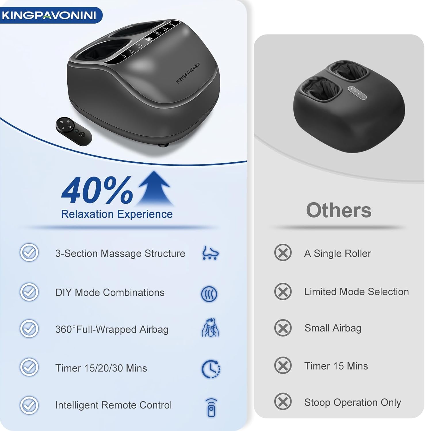[Experience a Full-Foot Massage with Warmth] KingPavonini shiatsu foot massager adds airbags at the ankles and toes, truly covering your feet comprehensively, not just the soles. The foot massager for plantar fasciitis provides warmth for cold feet, with a choice as well of low or high warming (110°F/119°F). Whether elderly people or office workers standing or stiff for a long time, they can enjoy professional massages at home.