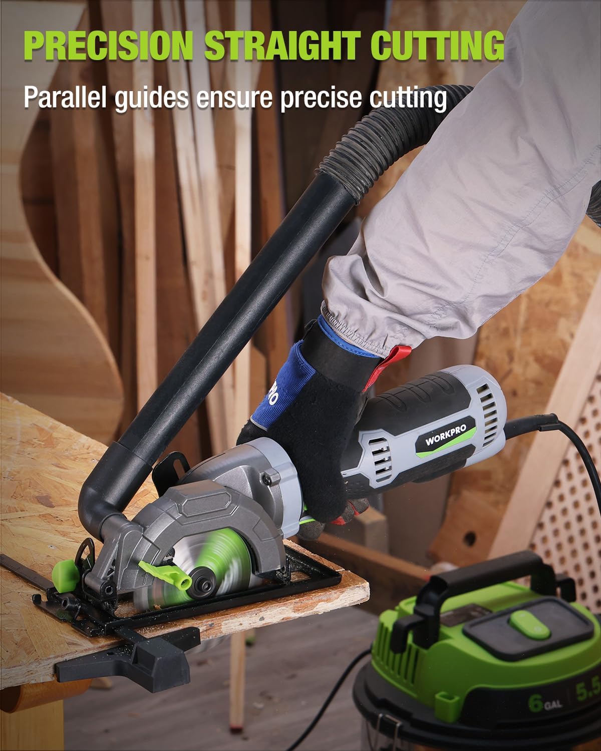 Clean & Precise Cutting: The included parallel guide ensures accurate, straight cuts, enhancing the quality of your finished projects. Paired with the dust hose and vacuum adapter, this mini circular saw also helps maintain a clean and tidy workspace, making every cut both precise and mess-free