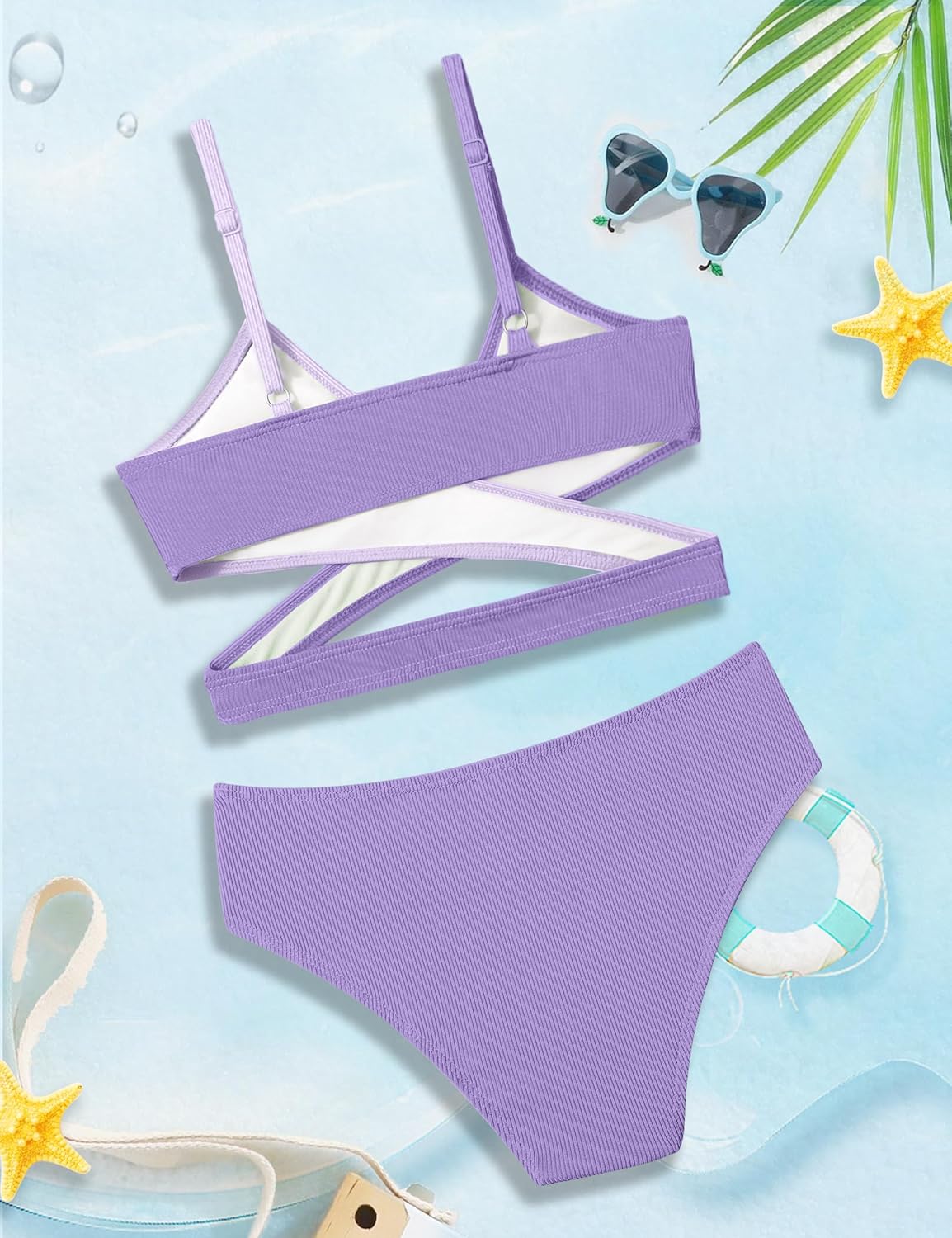 Girls Swimsuits Size 10-12 Girl Bathing Suits Size 10-12 Criss Cross Bikini Two Piece Swimsuit for Teens V-Neck Swimwear Purple Girls Swimwear