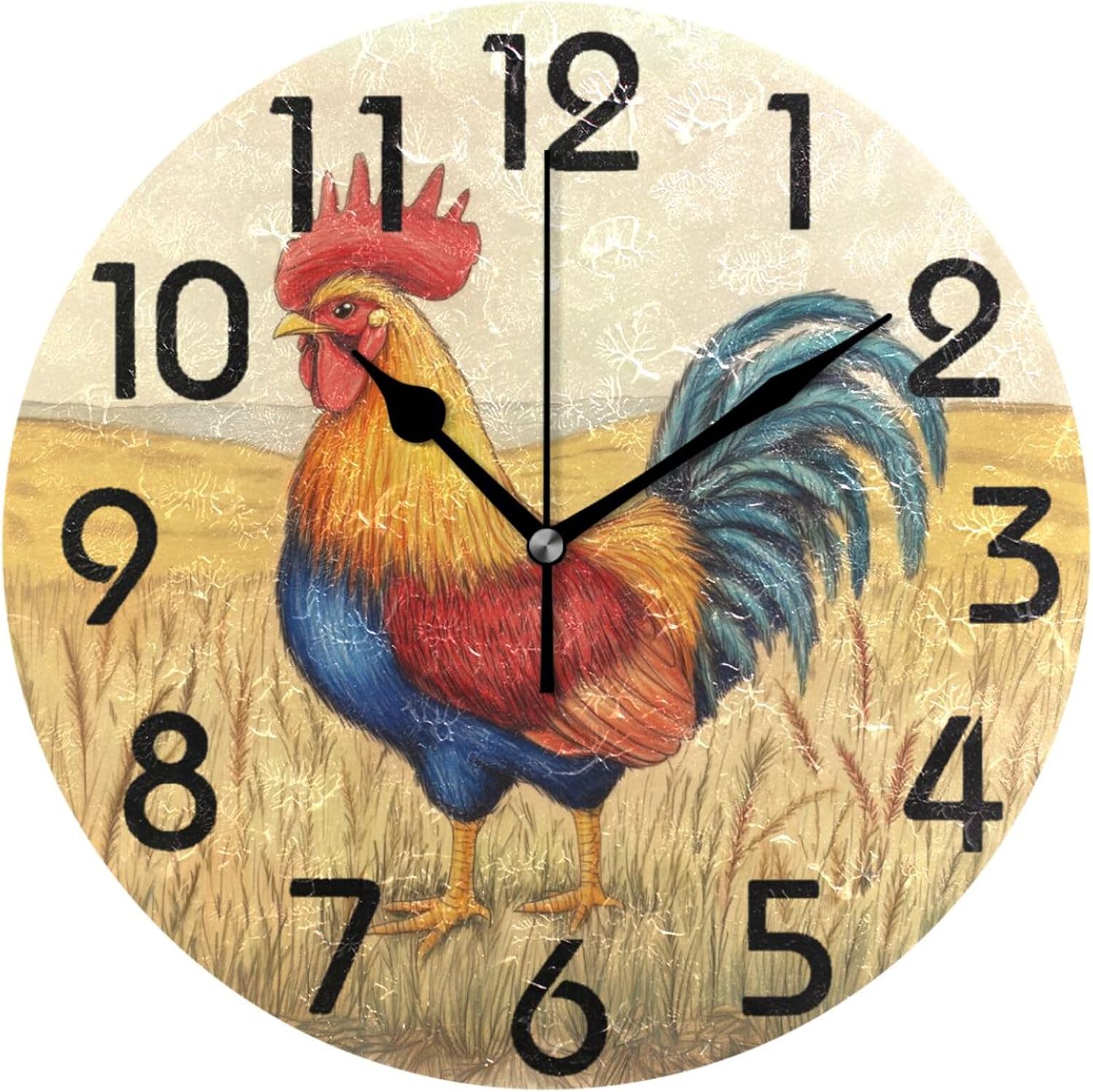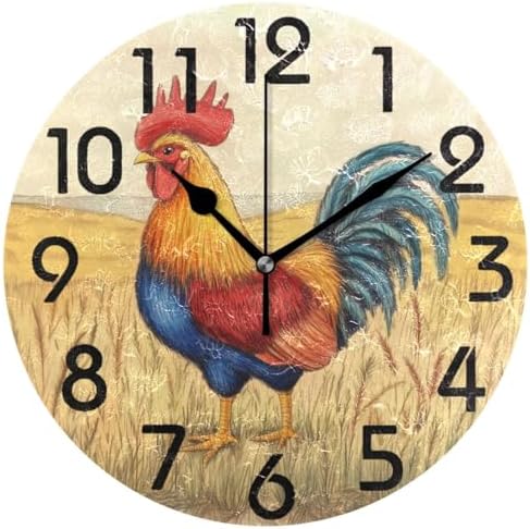 Large 10 Inch Round Wall Clock, Rural Retro Filed Rooster Battery Operated Analog Quiet Non Ticking Desk Clock Decor for Home/Kitchen/Living Room/Bedroom/Bathroom/Office/Classroom