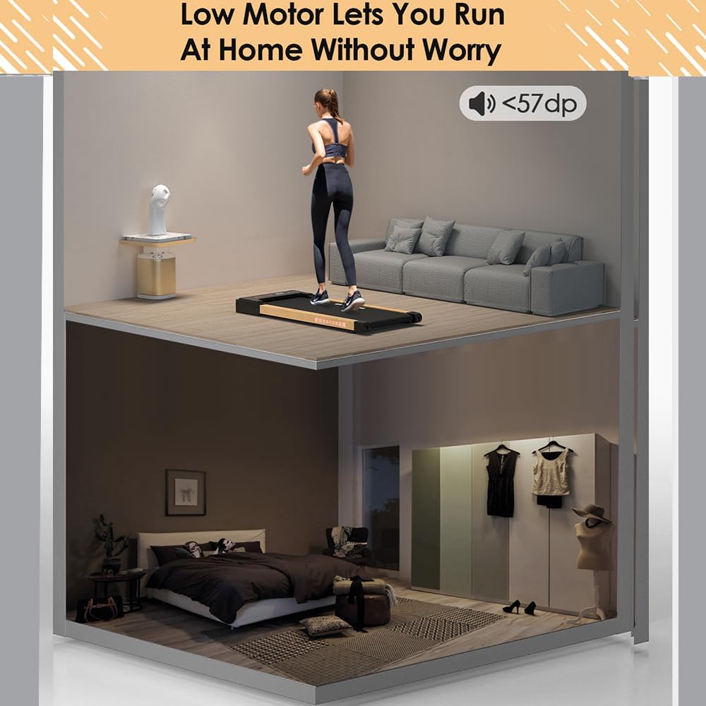 No Assembly Walking Treadmill: Desk Under Treadmill, comes fully assembled and ready to use right out of the box. Easily take this walking mat anywhere you like and start a cardio workout while taking care of business, watching a show or reading a magazine. Motorized Manual Treadmill with Digital Monitor: Measure your calories burned, speed, time and distance on the large 13.7-inch x 2.34-inch display. You can pause the walking mat at any time, and he'll save your running data very conveniently, so you'll always know how you're doing. Exercise makes life better. Powerful 2.25HP Silent Motor: This under table treadmill is equipped with a powerful 2.25HP silent motor and the under table treadmill can hold up to 265 pounds. The vibration and noise reduction features of the under table treadmill make your run quieter, safer and more stable. 12 Programs and Remote Control: The remote control makes it easy to adjust the speed while you run and stop instantly. There are 12 programs for you to choose from, these easy-to-use exercise programs help to improve cardiovascular health, enhance fitness and burn fat. Easy to store and move: The desktop treadmill features a space-saving design and measures only 48.81“ x 21.26” x 4.33”, which makes it easy to place under your desk, bed or sofa. Built-in wheels make the portable treadmill easy to move. No damage to floors while moving.