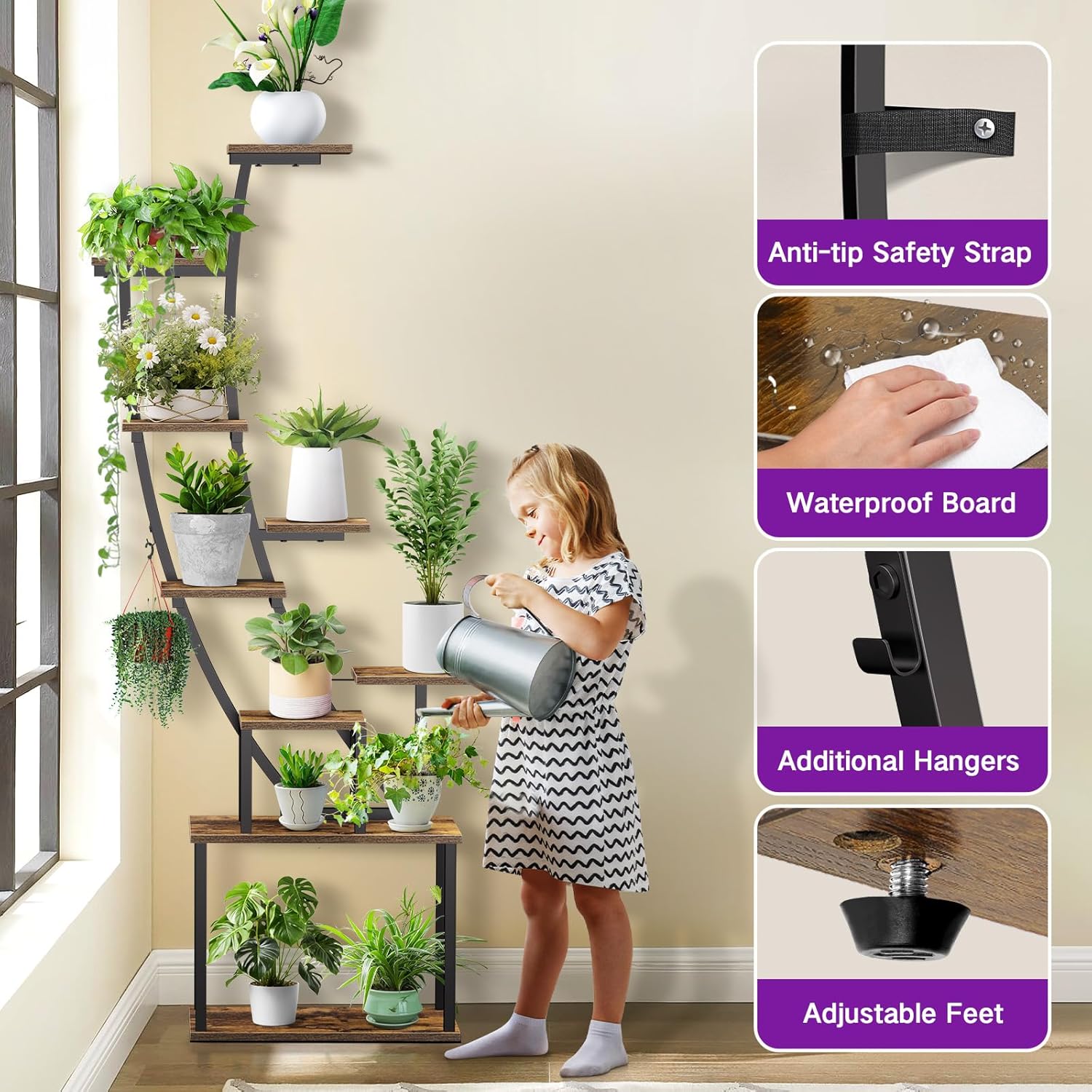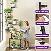 Durable and Safe Design: The indoor plant stand is made of high-quality steel tubes (0.85mm thick) and thick particleboard, ensuring sturdiness and durability. The metal frame is coated with anti-rust paint, while the smooth wooden shelves have a water-resistant finish for easy cleaning. For enhanced safety, furniture straps are included to secure the stand, making it a reliable choice for homes with children or pets to prevent tipping.