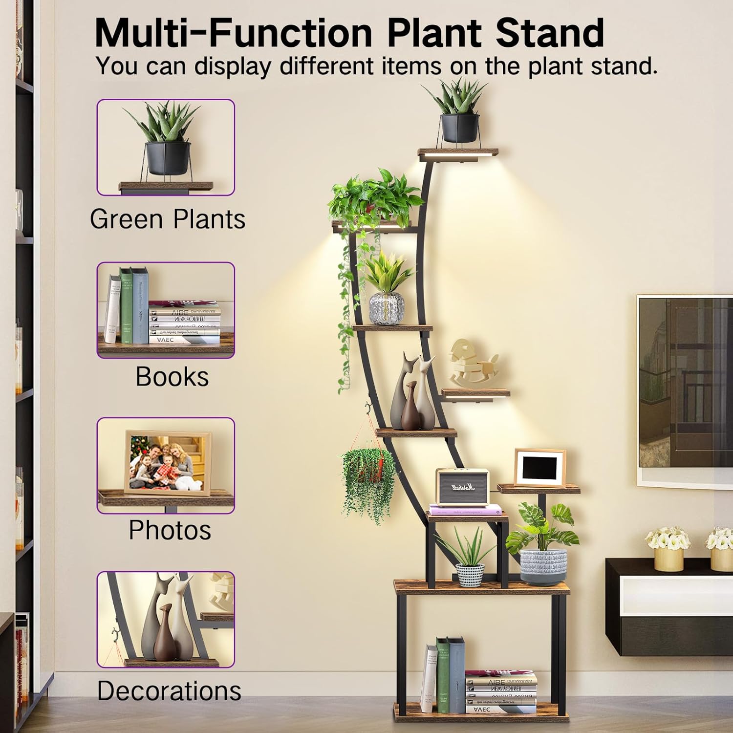 9-Tier Tall Plant Stand with Ample Storage: Designed with an elevated height of 63", this plant shelf features 9 tiers, 9 individual pot holders(each supporting up to 22 lbs), and 1 hanging hook(supports up to 11 lbs), offering plenty of space to showcase your plants. Beyond plants, it doubles as a versatile display shelf for books, photos, collectibles, awards, decorative items, crafts, and more. Its tall, stylish design adds a creative touch to your home decor.