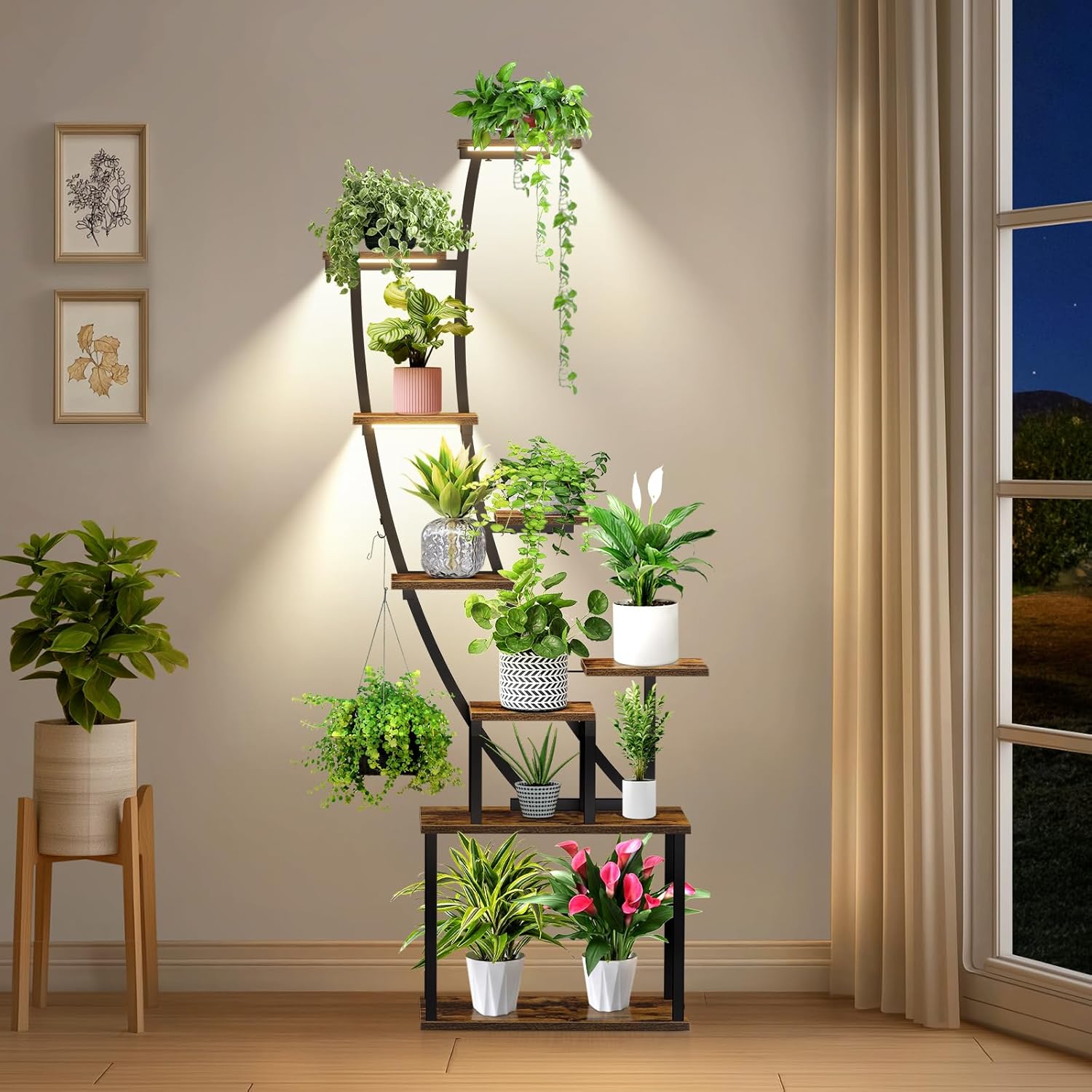 Full Spectrum LED Light: Struggling with shorter days and less sunlight? Our plant stand with grow lights mimics natural sunlight (380nm-800nm), giving your plants the light they need for healthy growth, closely mimicking natural sunlight to ensure your plants thrive year-round. The lights can go on the shelves you decides on. It feature 3 color temperatures (warm, warm white, daylight) and dimmable brightness (10%-100%) to support your plants at every stage. No need to move plants outdoors-place this stand anywhere indoors for optimal light. It works as a night light, too.