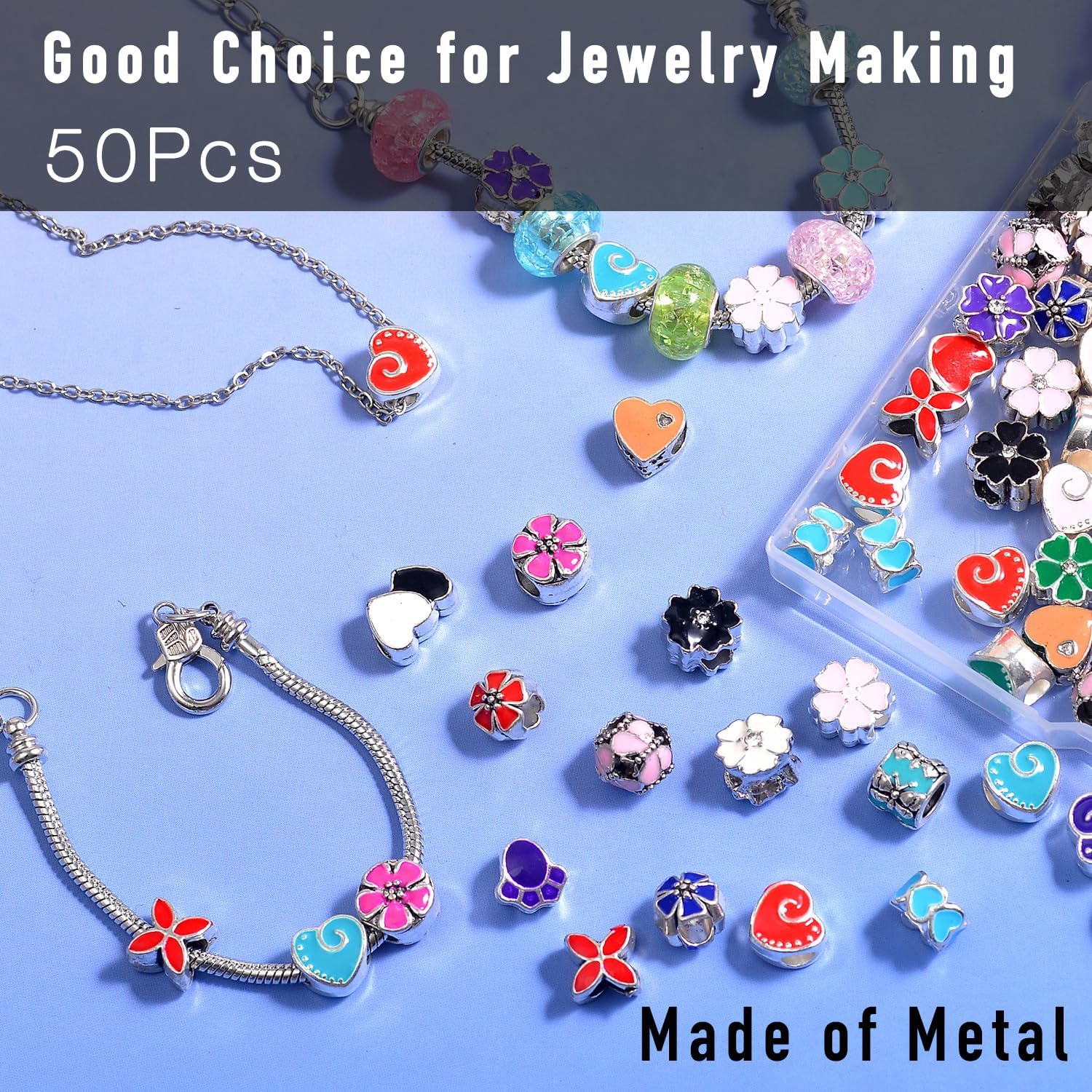 stino 50pcs Large Hole Metal Spacer Beads for Bracelet Necklace Keychain Making, European Enamel Focal Beads, Jewelry Findings & Supplies for Bracelet, Mixed Style (50Pcs Enamel)