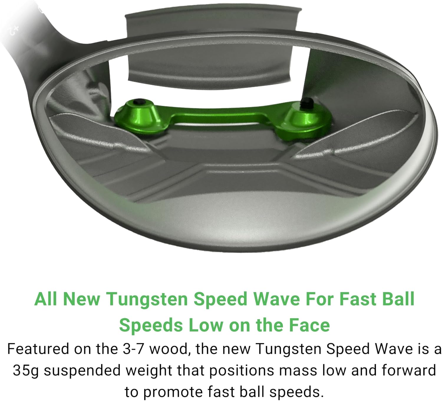 All New Tungsten Speed Wave For Fast Ball Speeds Low on the Face. Featured on the 3-7 wood, the new Tungsten Speed Wave is a 35g suspended weight that positions mass low and forward to promote fast ball speeds. This new, innovative design is engineered specifically to enhance misses low on the face – a typical miss for most players.