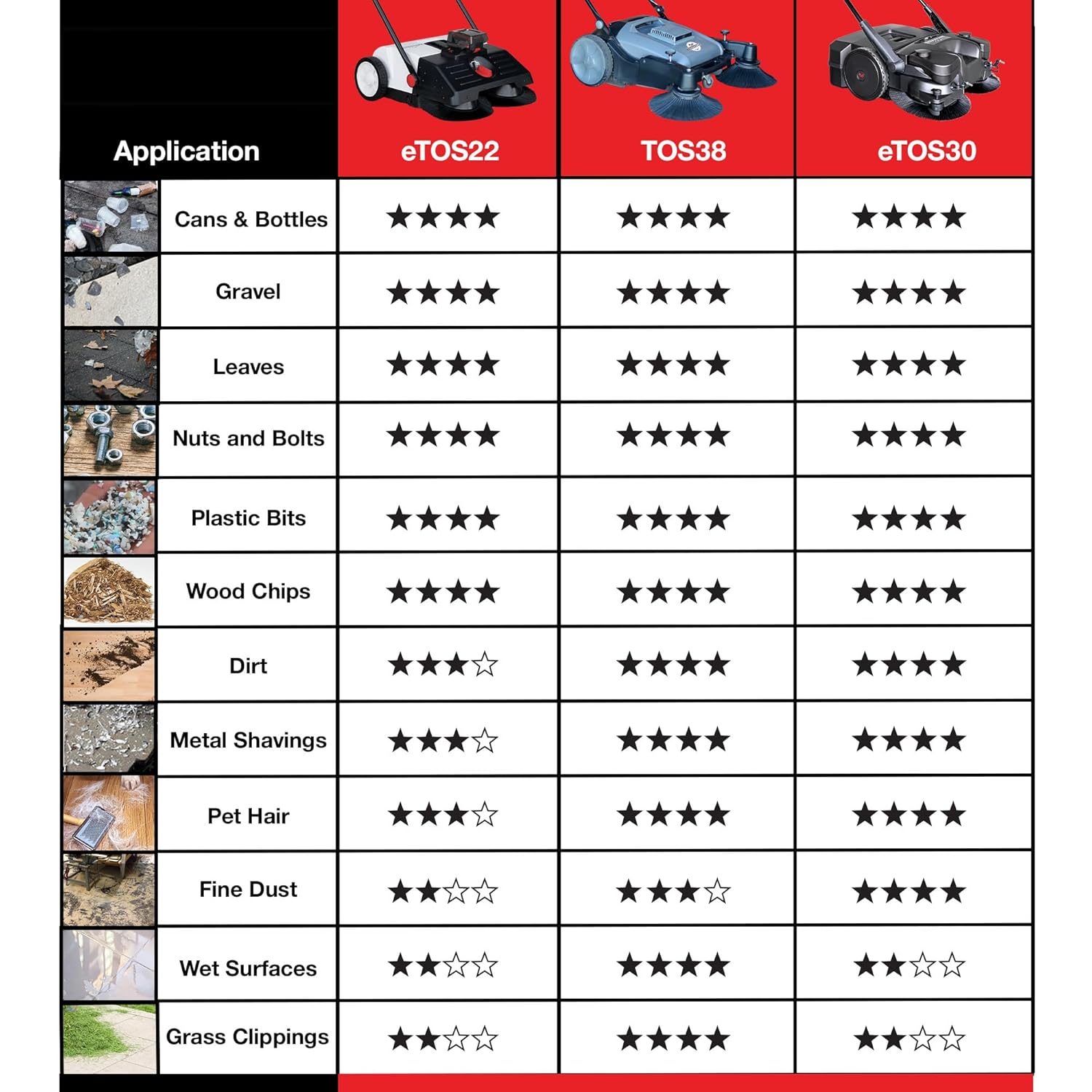 Upgrade your cleaning game with the Tomahawk 22" Battery-Powered Push Sweeper, designed to make cleaning large areas faster and easier. With a wide 22-inch sweeping path, powered dual brush system, and an easy-to-use adjustable handle, this sweeper ensures a thorough clean in both indoor and outdoor spaces. Whether you're maintaining workshops, garages, driveways, or patios, the eTOS22 delivers consistent performance on wet or dry surfaces. Powered by a long-lasting 18V battery, the eTOS22 runs up to 5 hours on a single charge, making it perfect for extended use in commercial or residential settings. The large 6-gallon waste container ensures minimal stops to empty debris, allowing you to clean up more area in less time.