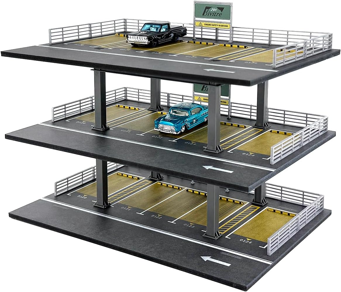 1/64 Scale Die-cast Model Car Display Case Organizer - Parking Garage Diorama Compatible with Hot Wheels Matchbox Mini GT,for Toy Car Display and Storage 15 Parking Spaces(Horizontal Railing)