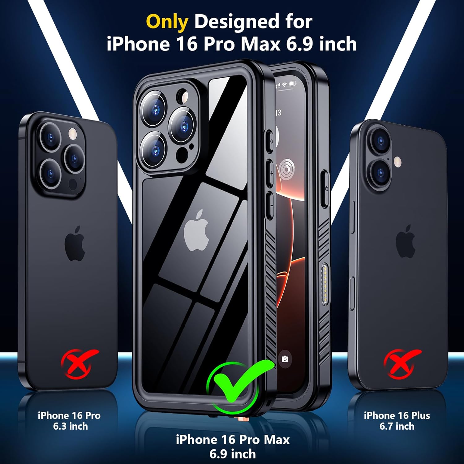 【IP68 Waterproof】: This iPhone 16 Pro Max waterproof case is resistant to water, dust, dirt, snow and spills and splashes from everyday liquids. In addition, the washable design ensures easy cleaning and keeps your phone and case always stay clean and looks like new. (Note: Please check all of the plugs are sealed before using)