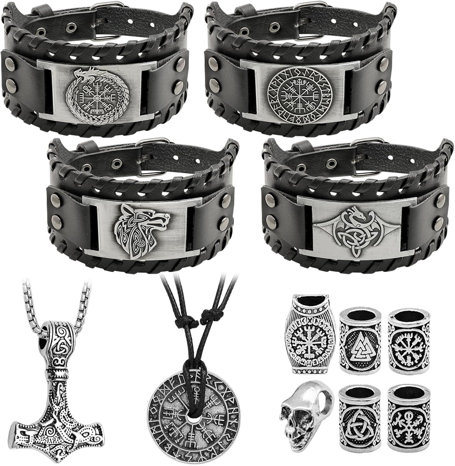 12 Pcs Viking Bracelet Nordic Amulet Accessories for Men Rune Compass Dragon Fenrir Wolf Bracelet Norse Talisman Necklace Viking Hair Accessories for Men Women