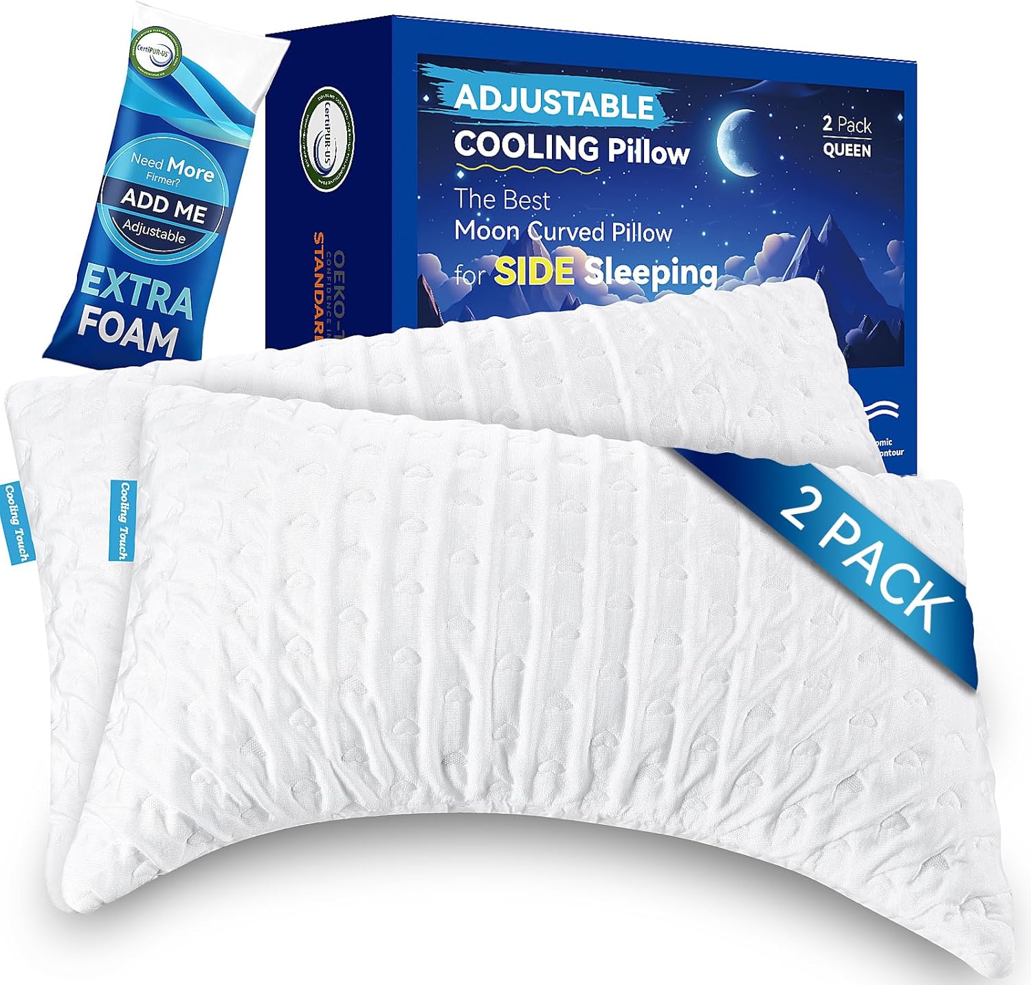 Side Sleeper Pillow for Adults, Cooling Cervical Pillow for Neck and Shoulder Pain Relief, Adjustable Shredded Memory Foam Curved Neck Support Pillow, Queen Size Set of 2, Extra Fill Included